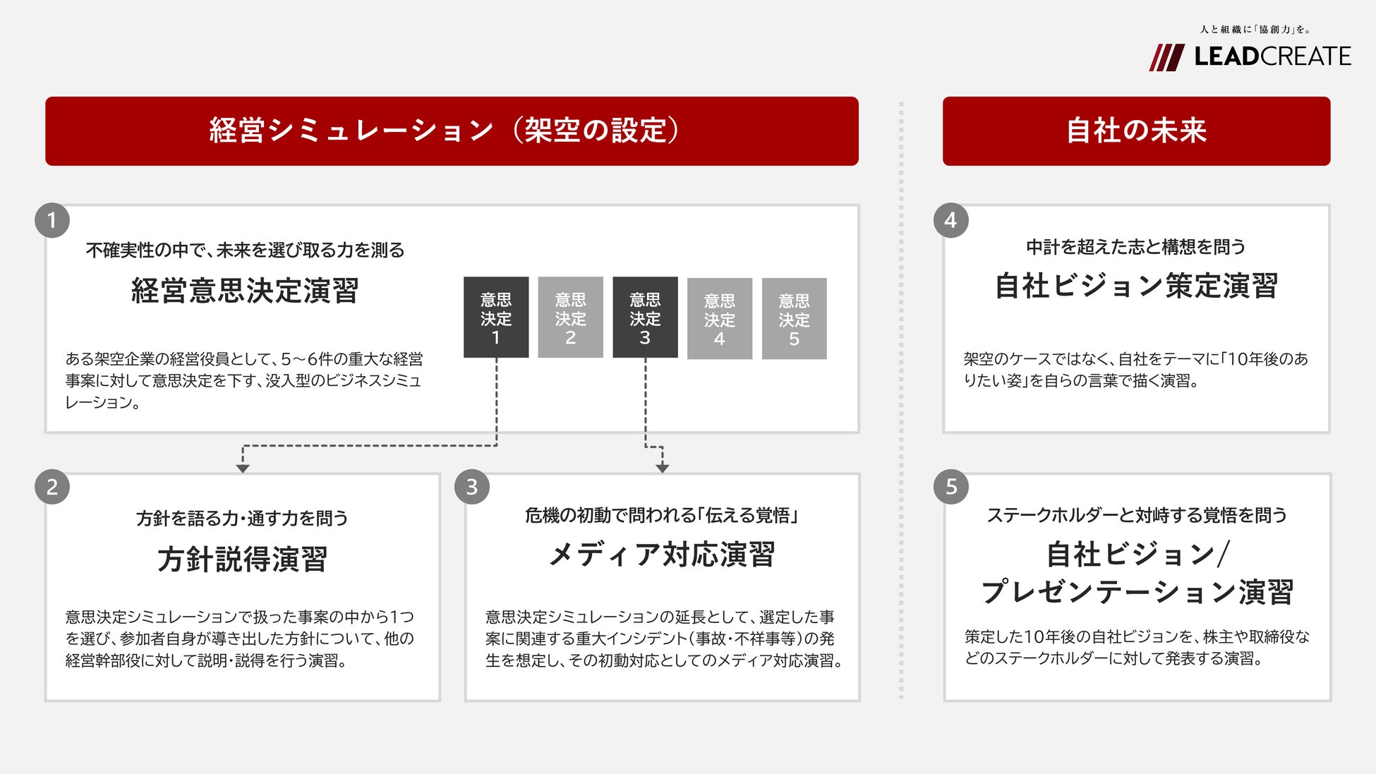 Authenticプログラムでは、「経営シミュレーション(架空の設定)」と「自社の未来」の2つの状況設定と、5つのシミュレーションに取り組んでいただきます。