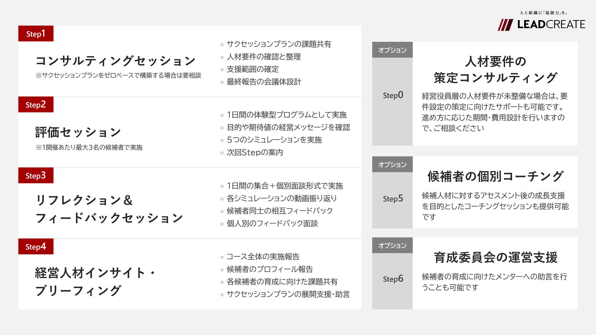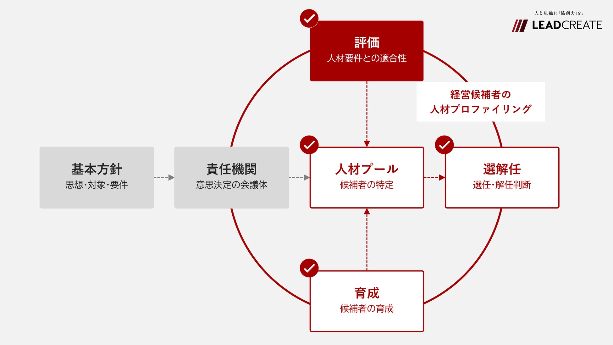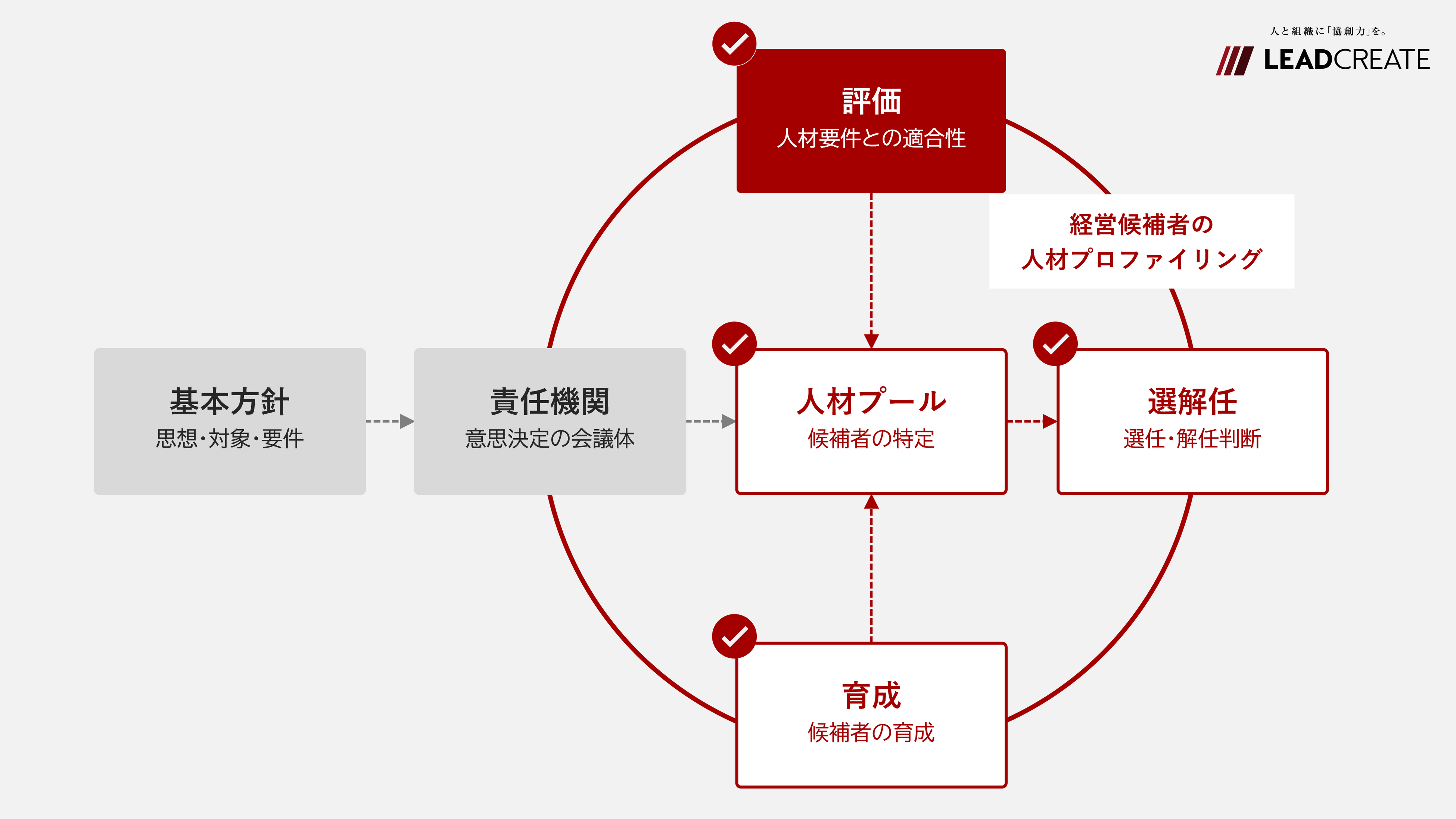 リードクリエイトは、後継候補者の特定や、後継者選任における判断のベースとなる「評価」の観点から、経営候補者の人材プロファイリングにスコープを定め、人材プール、育成、選解任に関わる各社のサクセッションプランを有機的に機能させるための支援を行うことが可能です。