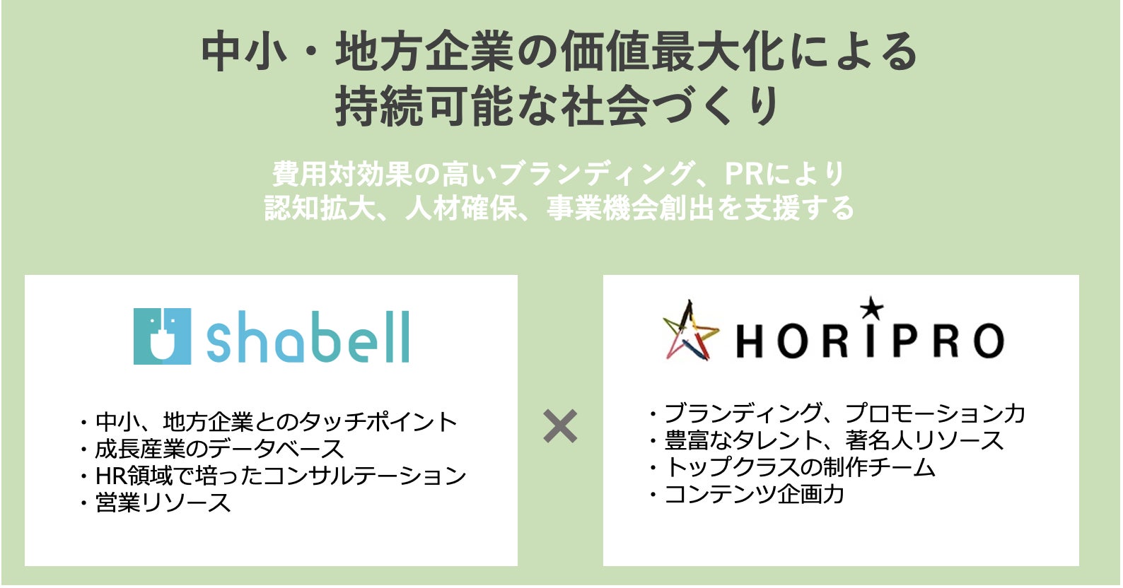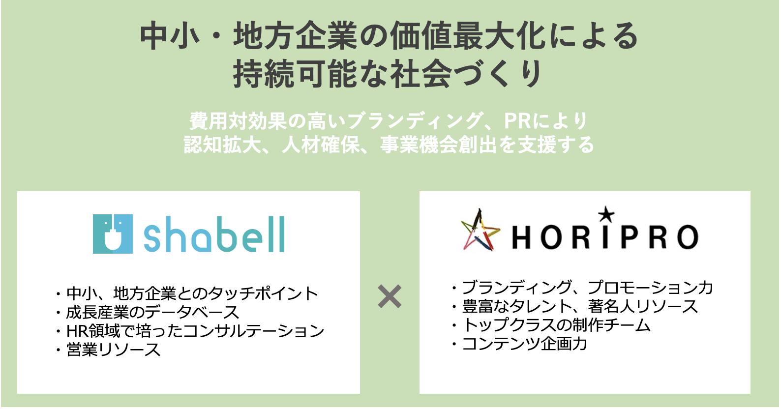 そのような中で「新しい価値基準を創造し、すべての人の適材適所を実現させる」をミッションに掲げる当社では、これまでHR領域で培ってきた中小企業・地域産業とのタッチポイントを活用し、企業の経営課題の解決策としてのブランディング施策やプロモーション企画をホリプロ社の制作・企画のクオリティで提供することを開始いたします。