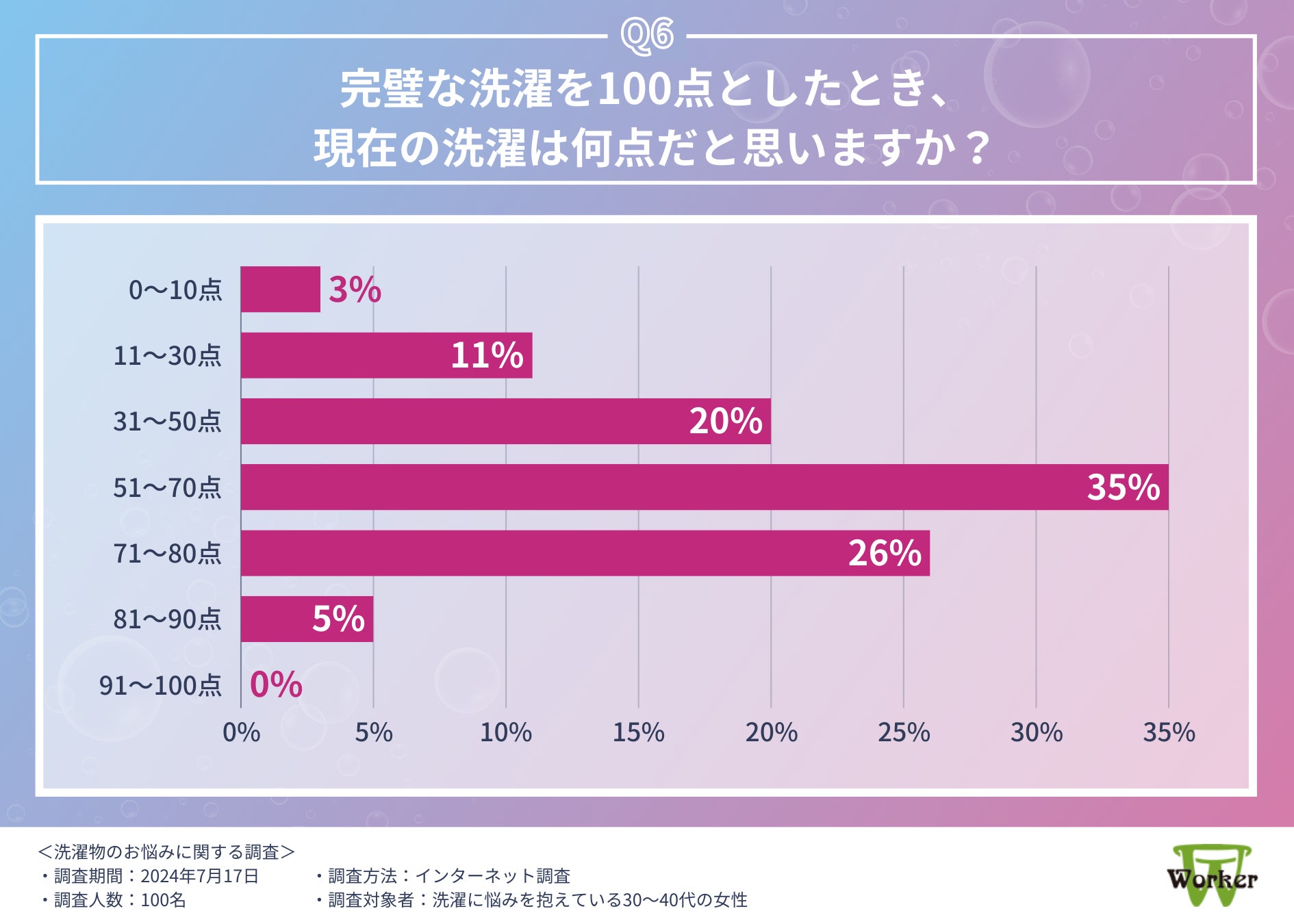 完璧な洗濯を100点としたとき、現在の洗濯は何点だと思うか伺ったところ、「51〜70点(35.0%)」「71〜80点(26.0%)」「31〜50点(20.0%)」という回答が集まりました。