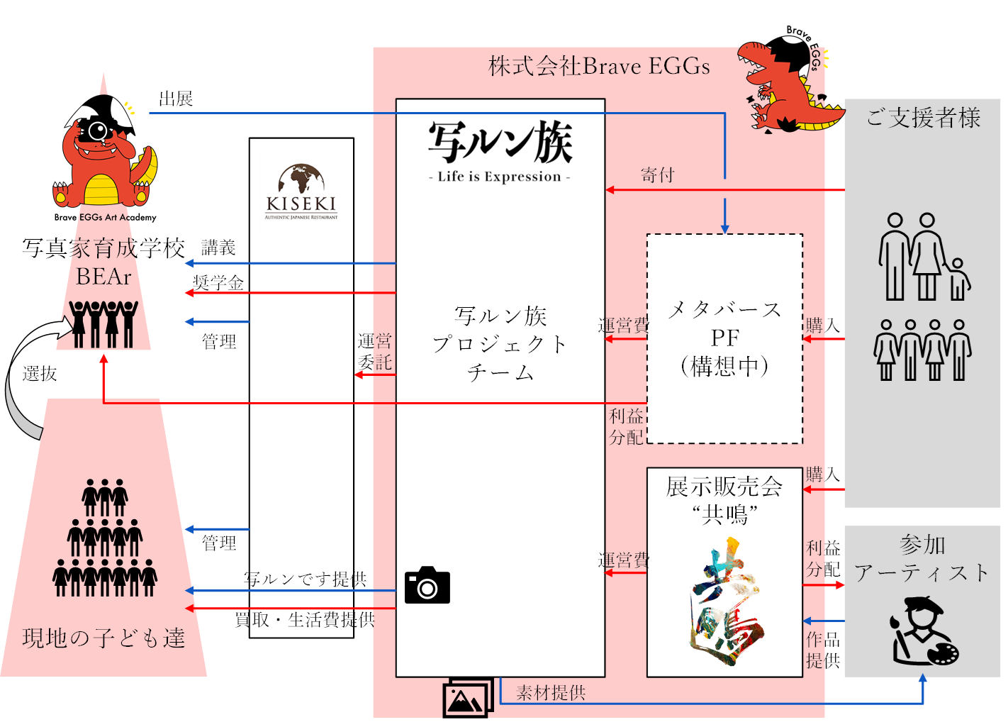 (4)撮影された写真をアーティストに題材として提供し、コラボ作品の制作を依頼。コラボ作品を展示・販売し、利益の50%をアーティストに、残りの50%を将来の写真家育成学校BEAr運営費用に充当