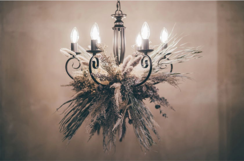 フラワーシャンデリアは「今よりさらに豊かな時間が増えますように」という想いのもと制作され、経験豊富なフラワーアーティストが1点1点丁寧に手掛ける「1点もの」となっております。作品の数々は、花材選びから照明との相性、シルエットや全体のバランス、灯りをつけた瞬間の陰影までひとつひとつ緻密に計算されています。どの商品も見ているだけでも心躍ること間違いなしです。制作過程で完全に水切りをしているので、ドライフラワーでよく気になるような匂いはございません。また、枯れる商品ではございませんので、年月の風合いも楽しみながら半永久的にご使用いただけます。日常のインテリアとして、匂いがなく半永久的にご使用いただけることから、小さなお子様がいらっしゃるご家庭でも簡単にインテリアをリフレッシュできるアイテムなのでお勧めです。また特別なシーンとして、新築祝い・開店祝いといったギフト、カフェやテナントなどのショップディスプレイ、さらにウェディングシーンではウェルカムアイテムやメインテーブルに取り入れることでより一層個性的で唯一の空間演出ができるかと思います。