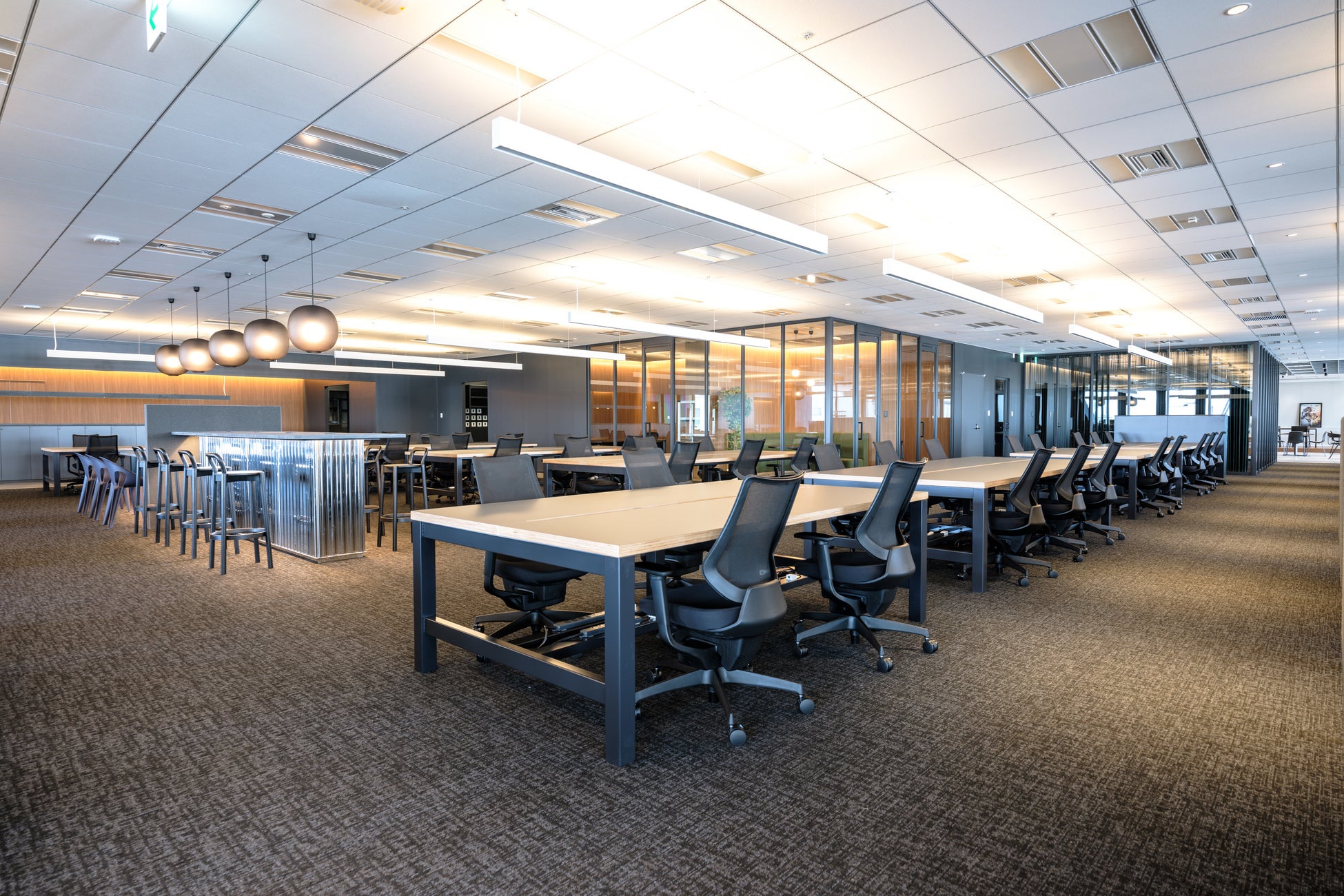 コミュニケーションの促進を狙い、オープンスペースをスポット的に複数配置。フレキシブルなレイアウト変更が可能で、最大100名規模のカンファレンスにも対応することができる