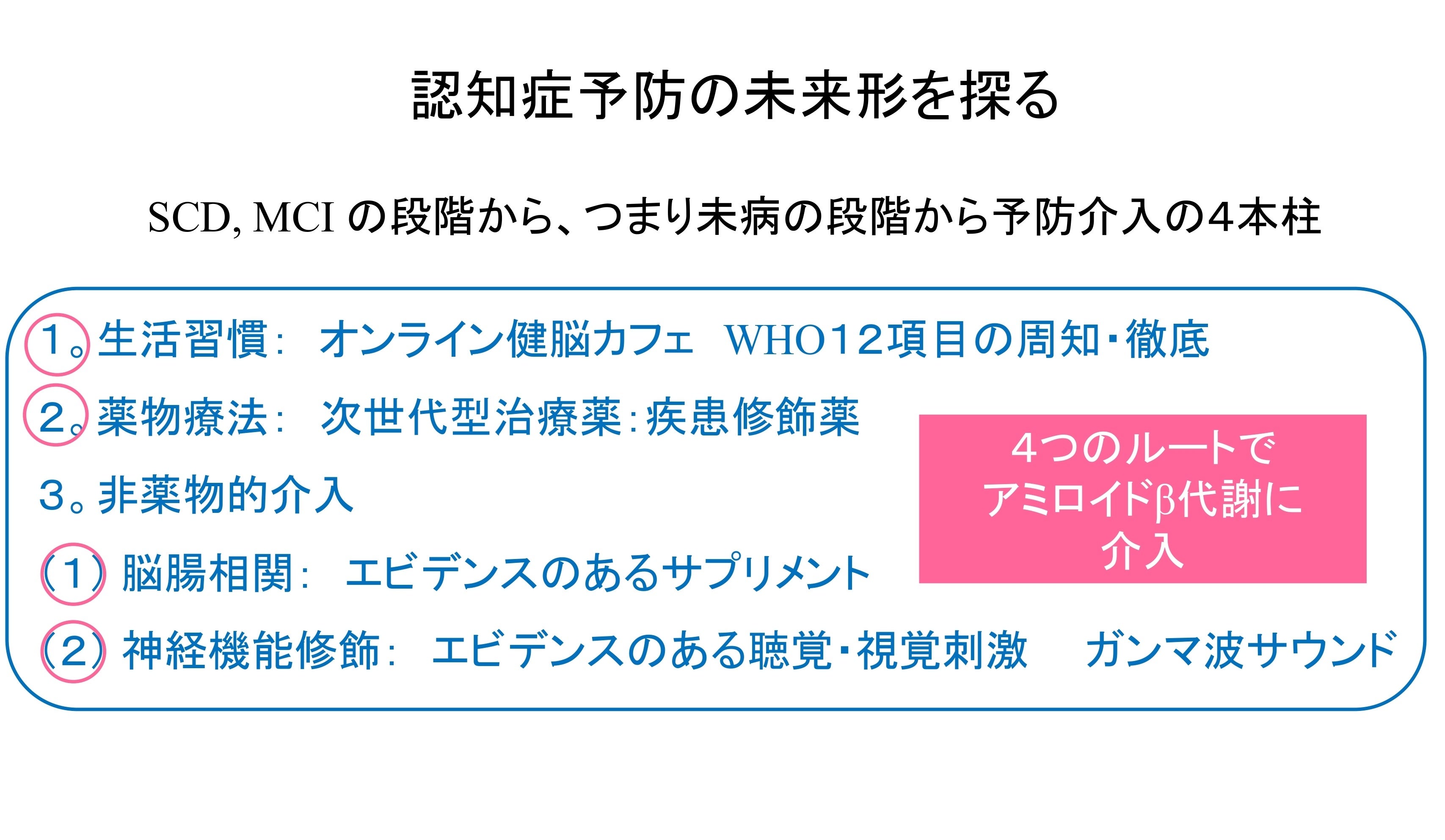認知症の新薬レカネマブの国内承認は、認知症研究のこれまでの歴史にとって非常に大きな一歩。軽度認知症、軽度認知障害を対象とするもので、認知症予防にとって画期的な未来につながるものだと解説した。新薬の導入によって将来的には一次予防ができるようになるという期待感についても語った。