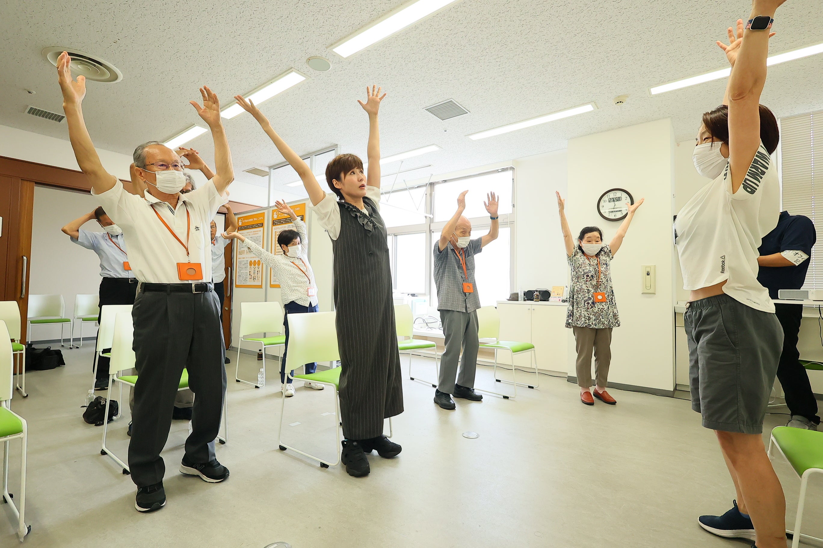 イベントの最後には健脳カフェで実際に行っている取り組みをにしおかさんが体験した。最初に体験したのは器具を使わずに体を動かす「ラクティブ」。一般利用者の方々と一緒に体験をいただき、約20分間運動に参加した。にしおかさんは終始笑顔で、健脳カフェ一般利用者の方と会話を楽しみながらラクティブを行った。体験の最後には「体を使って程よい汗をかいて、頭を使い簡単にできないものは冷や汗をかいて皆さんと笑った」と感想を述べた。
