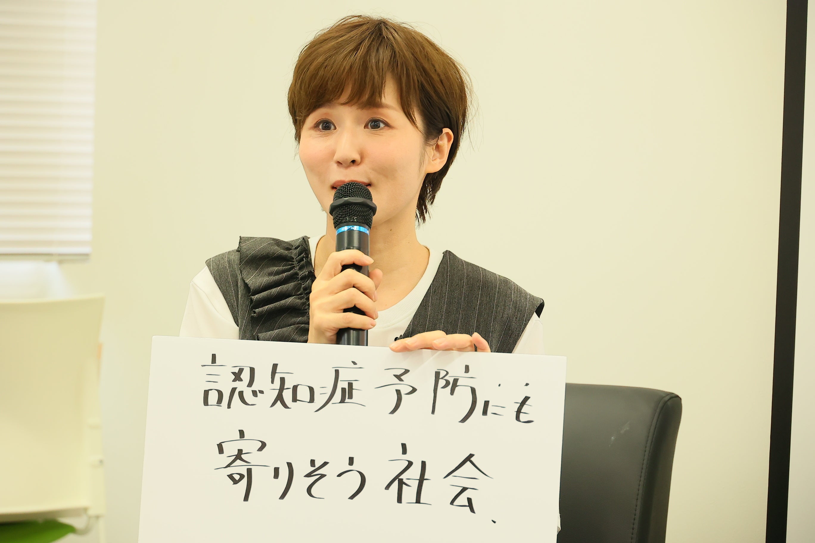 最後には「これから先、どんな社会になってほしいか」という問いかけにお二人がフリップで回答。新井平伊は「恐れるよりも迎え撃つ!」という力強い言葉を選んだ。この言葉について「認知症を心配する人が多い。これからいろんな予防が出てくるので、社会全体としてポジティブに認知症を迎え撃つという考え方が良いのではないか。」とコメント。