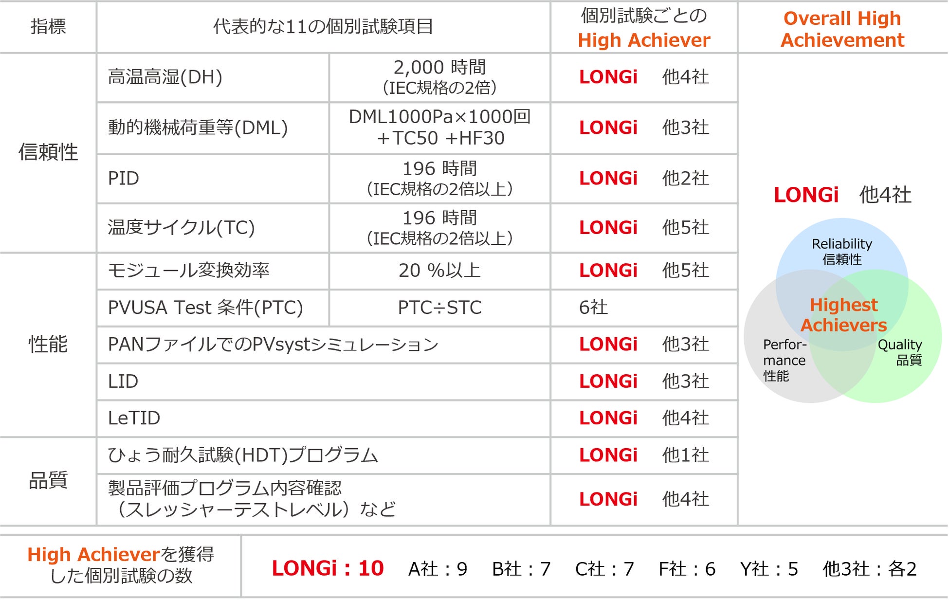 6月に発表されたこのレポートにおいて、LONGiは性能・品質・信頼性の3指標全体で優秀とされる「Overall High Achievement」を獲得した5社のうちの1社となっただけでなく、4年連続で獲得している唯一のメーカーとなりました。また、2022年版の11種の個別試験のうち、LONGiは最も多い10種で「High Achiever」を獲得し、またしてもLONGi製品の性能・品質・信頼性の高さが確認されました。