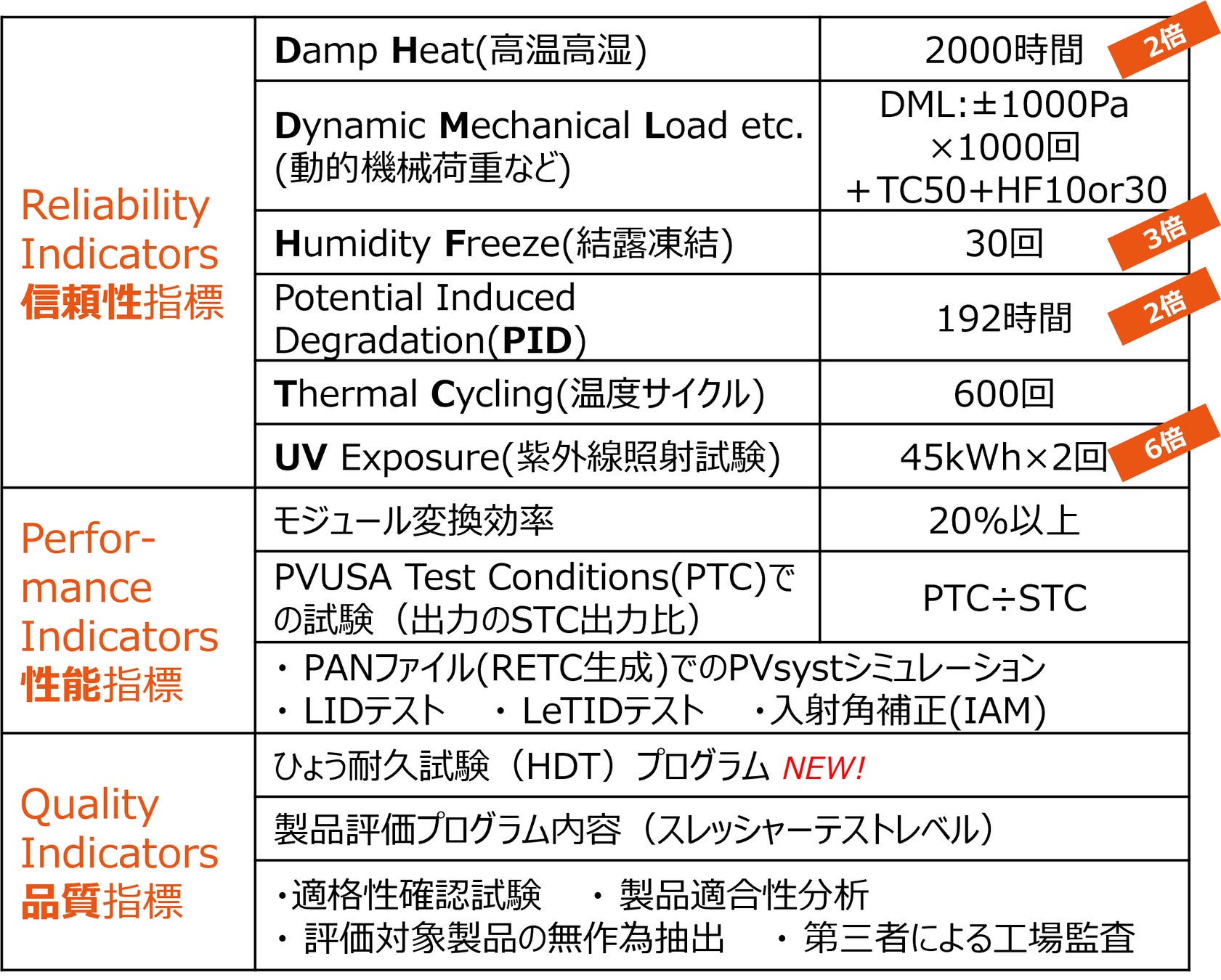 性能指標では、LID(光誘起出力低下)試験、LeTID(光・高温誘起出力低下)試験、実使用環境に近い条件(PTC)での出力値とカタログ出力値の比較、更には、モジュール変換効率や発電量シミュレーション結果も用いられます。