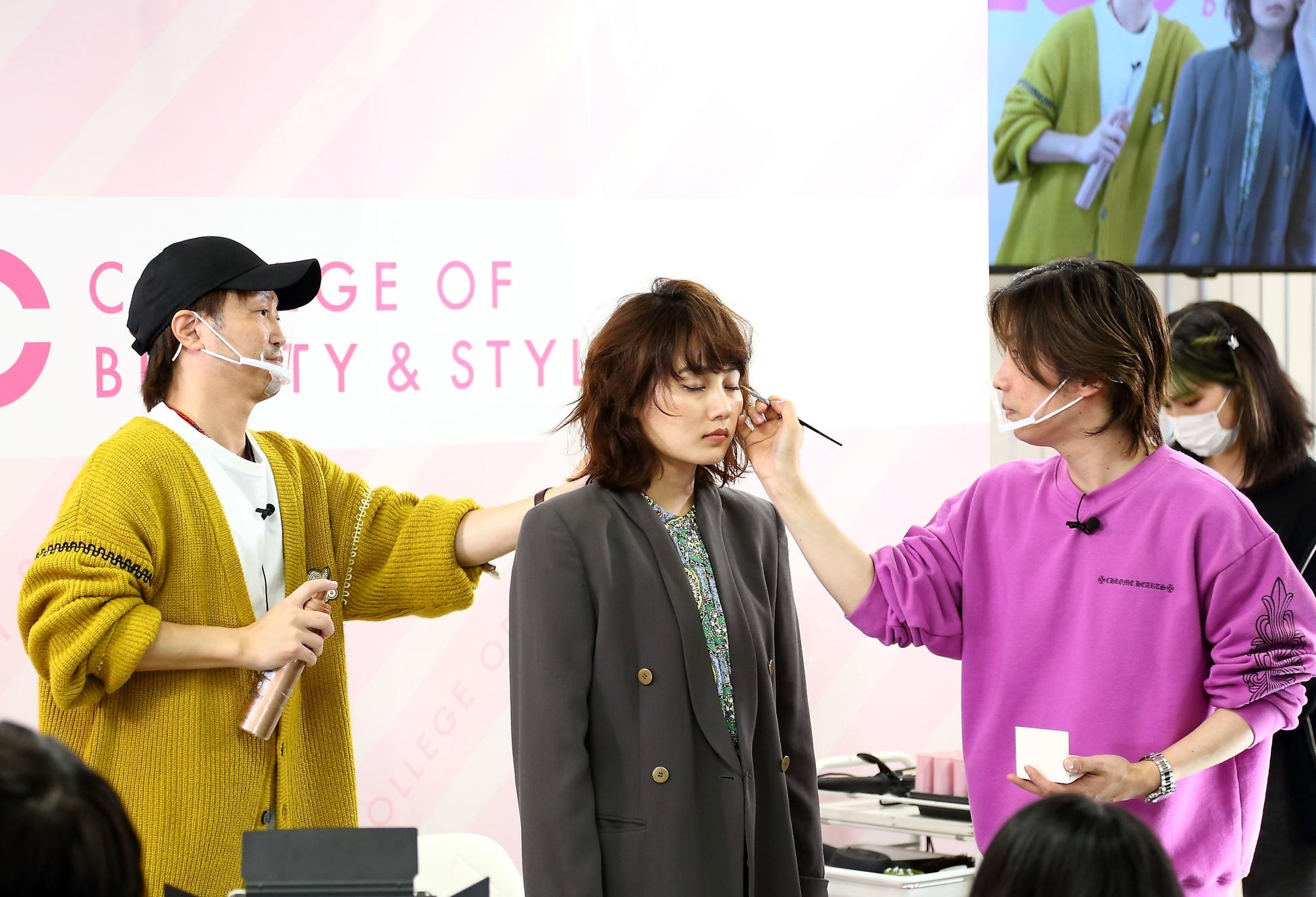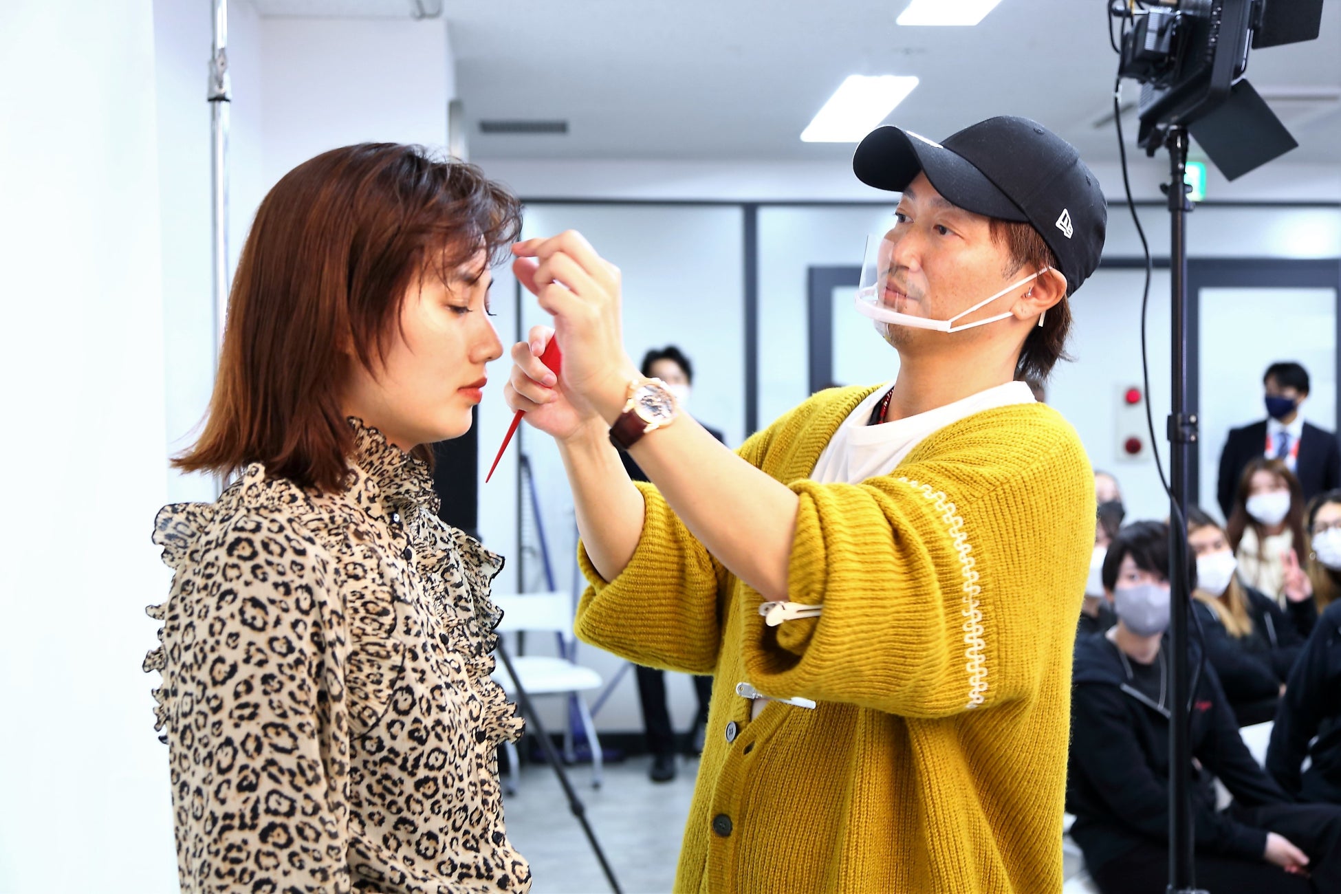 モデルの雰囲気や骨格を活かしたスタイルをその場で作り上げていくと同時に、小林氏による撮影デモも行われ、光の当たり方を意識したメイクや撮影を重ねるごとに完成に近づいていくヘアスタイルに学生の目は釘付け。美容師としてはもちろん、ヘアメイクアーティストとしての経験談や現場での貴重なエピソードも多数お話いただきました。