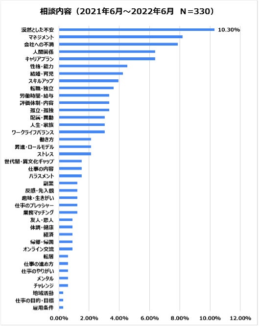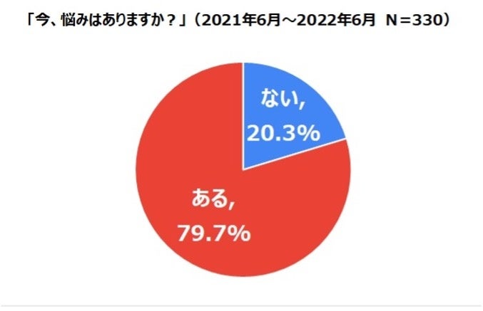 従業員は仕事だけでなくプライベートの悩みなど個人によって抱える悩みや課題も様々です。数年前は「キャリアアップ」「人間関係」などの悩みをお聞きすることが多くありましたが、ここ数年は「漠然とした不安」という声が多く、実際に2021年6月から2022年5月の相談内容では8割の人が「悩みがある」と回答し、内「悩み無し」という人を除くと「漠然とした不安」が1番多い相談内容という結果になりました。