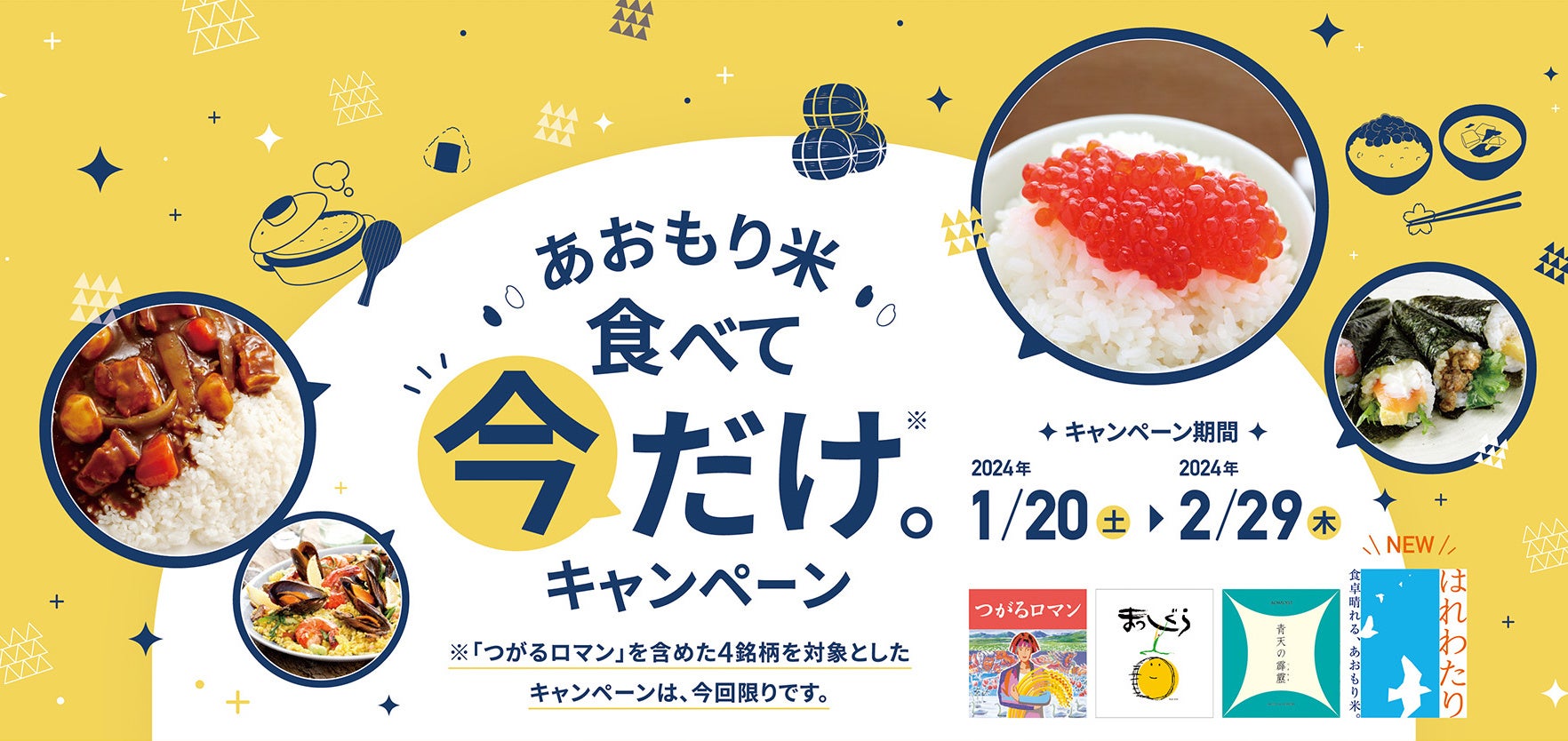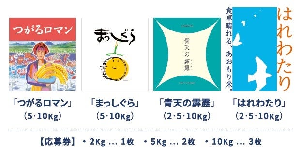 青森県産米「つがるロマン」「まっしぐら」「青天の霹靂」、そして新品種「はれわたり」を対象とした『あおもり米食べて今だけキャンペーン』を実施いたします。