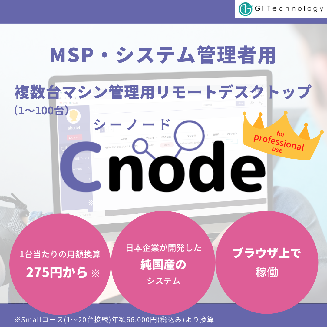 遠隔地のPCを「リモートデスクトップ機能」を用いて一括管理するシステム管理者・MSP用ツール『Cnode』を発売。ブラウザで遠隔地PCの管理ができる、リモートワーク時代の新しい管理ツールです。
