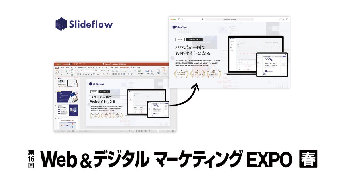 会期中は、3月18日にリリースした、パワポを30秒でWEBサイトにする「Slideflow(スライドフロー)」のデモンストレーションを実施。実際にスライドからWEBサイトへ変換する一連の流れを実際にご覧いただけます。