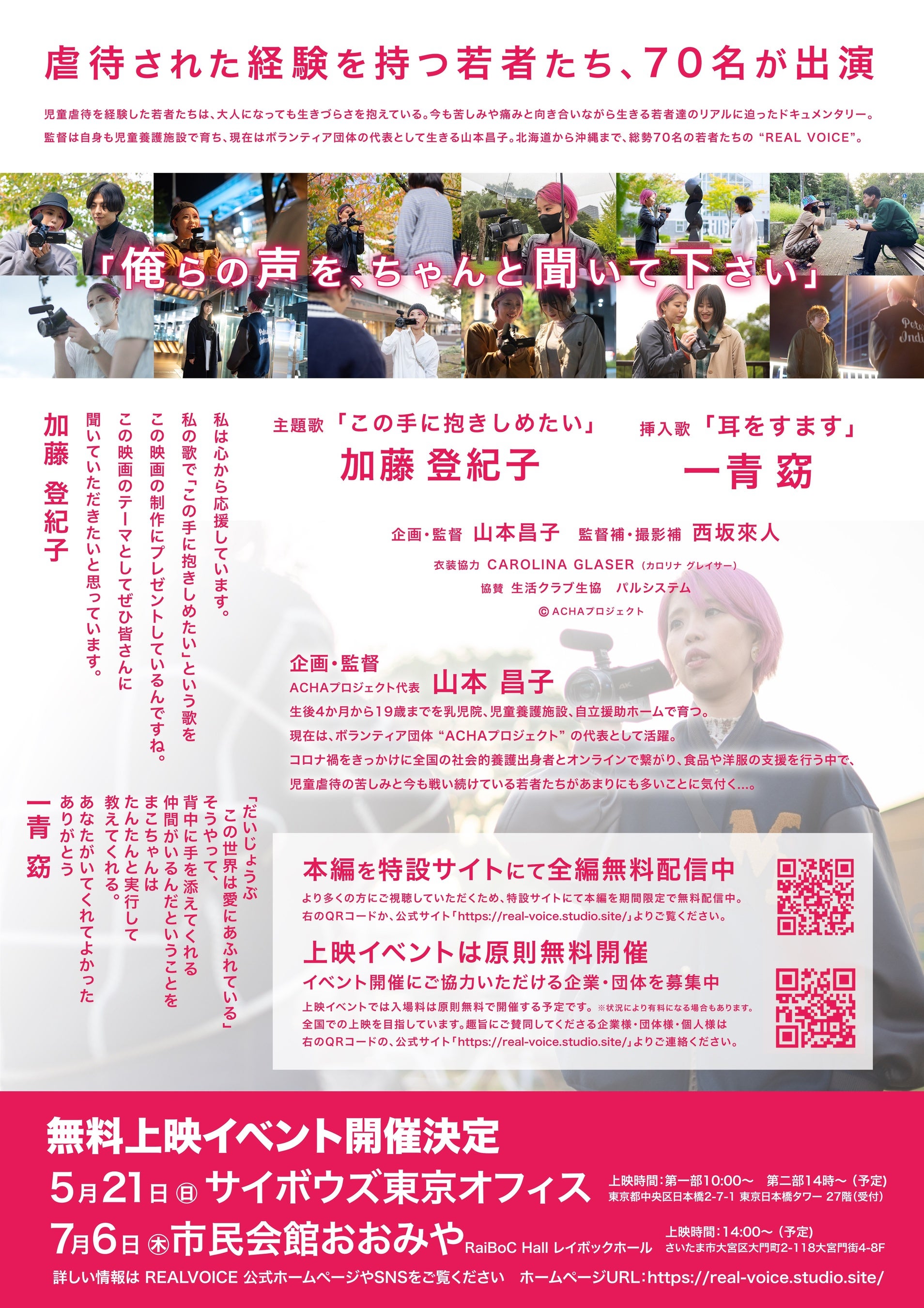 ひとりでも多くの観客に作品を届けたいという思いから、映画“REALVOICE” は同日20時に公式サイトから全編無料公開され、その後YouTubeでも視聴可能となった。