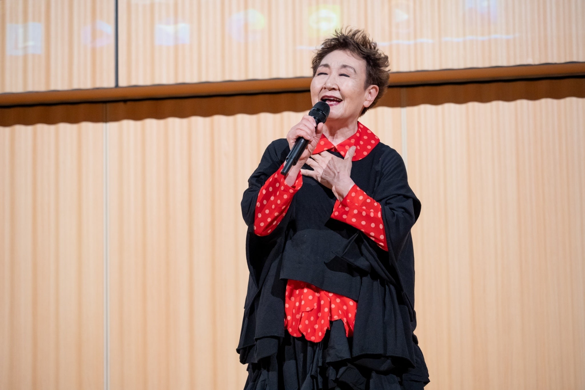 その後、歌手の加藤登紀子が登壇し、映画の中で登場しなかった母親についての思いを語り、楽曲「この手に抱きしめたい」を披露した。