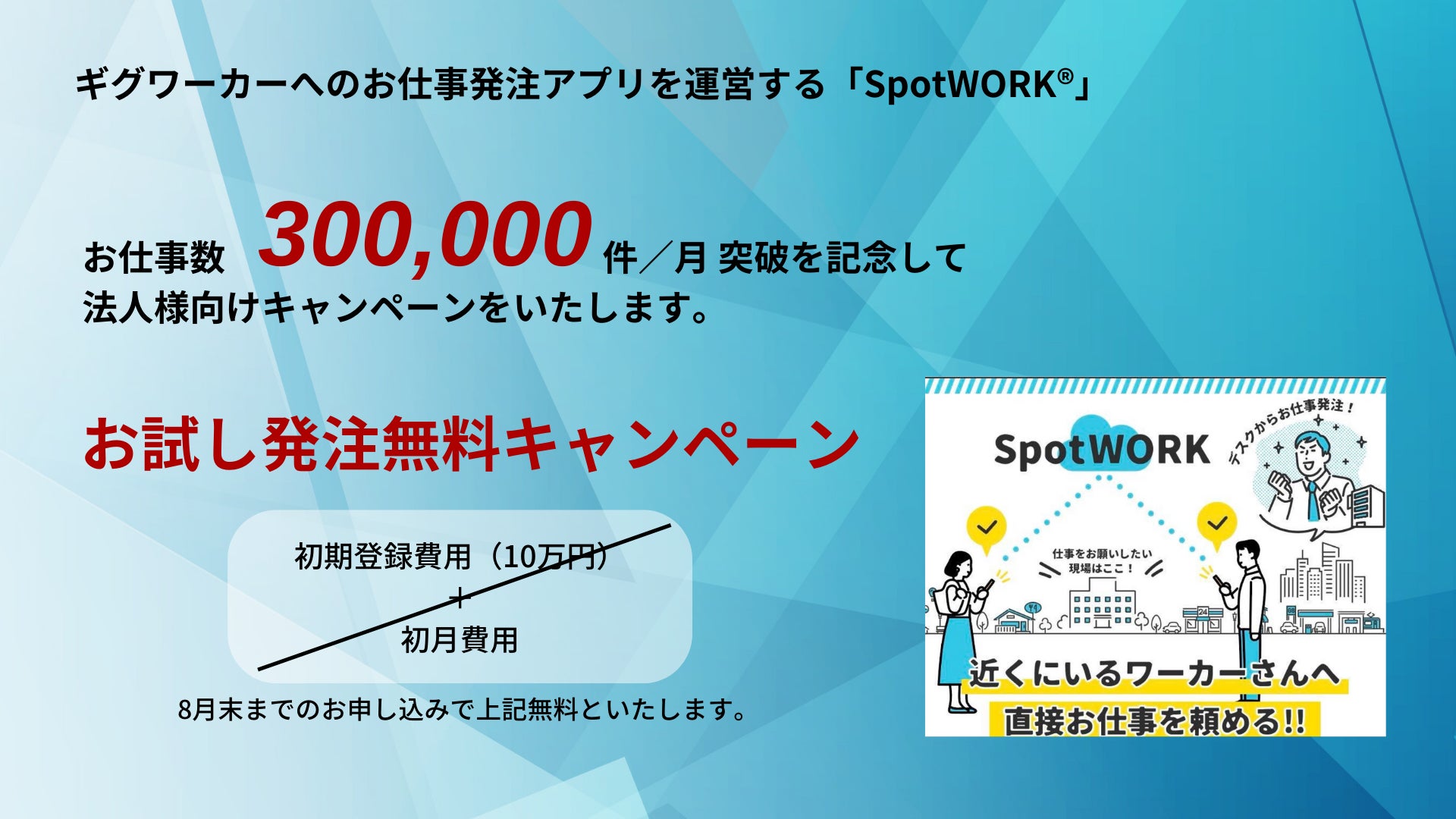 全国66,000ケ所、17,000人のギグワーカーへのお仕事発注アプリを運営する「SpotWORK®︎」が、30万件突破を記念して、法人様向けに導入費用+初月無料のキャンペーンを実施いたします。