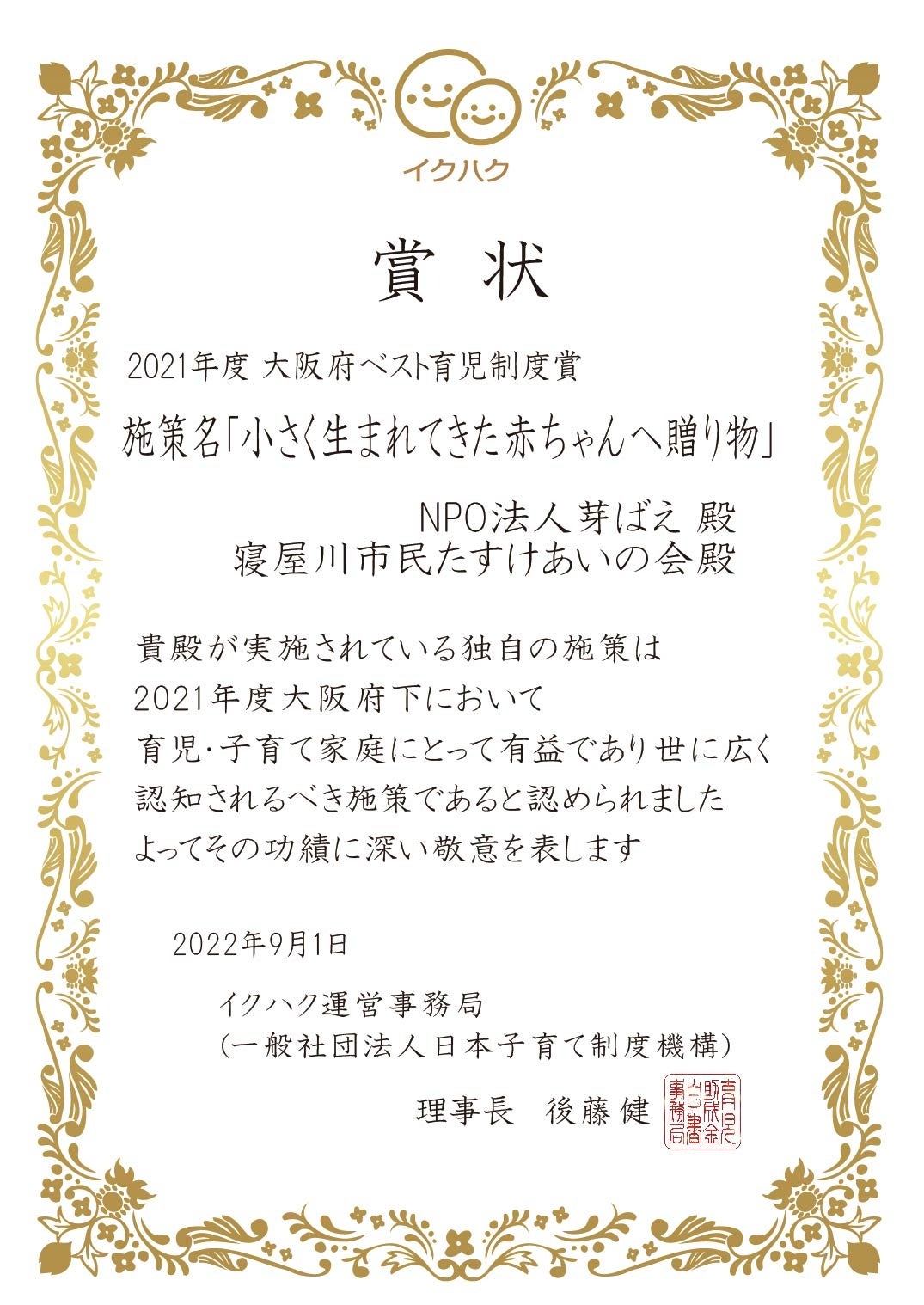 NPO法人寝屋川市民たすけあいの会とNPO芽ばえが協働して取り組む「小さくうまれてきた赤ちゃんへ かわいい産着、洋服を贈りたい!~めばえプロジェクト」が一般社団法人日本子育て制度機構が運営するイクハク(育児助成金白書)主催の 2021 ベスト育児制度賞を受賞しました。