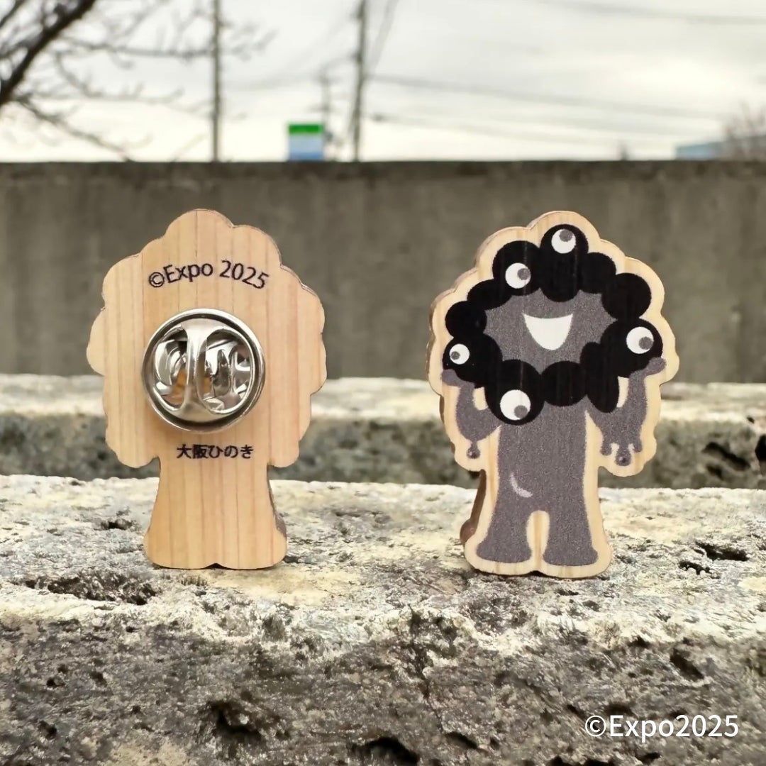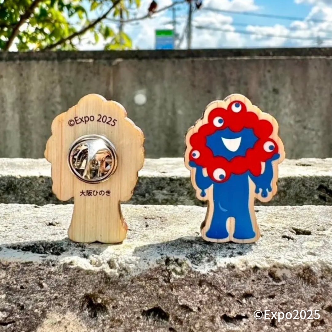 2025大阪・関西万博公式ライセンス商品。大阪府産ひのきを使用した木製バッチシリーズに新デザインが登場。完売していたミャクミャク木製バッチも数量限定で再販。
