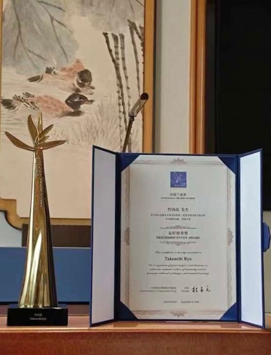 中国と外国の文化交流を推進するために際立った貢献をした人物の功績を称える賞「蘭花賞」の第1回授賞式が9月8日、北京で行われ、日本人初、日本人で唯一、竹内亮が受賞しました