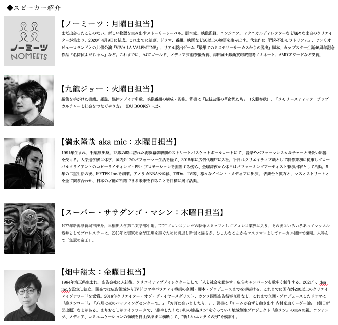 本番組は、まだ出会ったことのない新しい物語を生み出すストーリーレーベル「ノーミーツ」、ポップカルチャーから伝統芸能まで執筆し、数多くの書籍やメディアの編集も手がけるライター・編集者「九龍ジョー」、日本の才能が活躍できる未来を作ることを目標に掲げ活動するHYTEK Inc.代表「満永隆哉 aka mic」、新潟在住で国籍・年齢一切不明の謎の覆面レスラー「スーパー・ササダンゴ・マシン」 、2021年dea inc.を設立し独立、現在では広告領域からTVドラマやバラエティ番組の企画・脚本・プロデュースまでを手掛ける「畑中翔太」が登場。