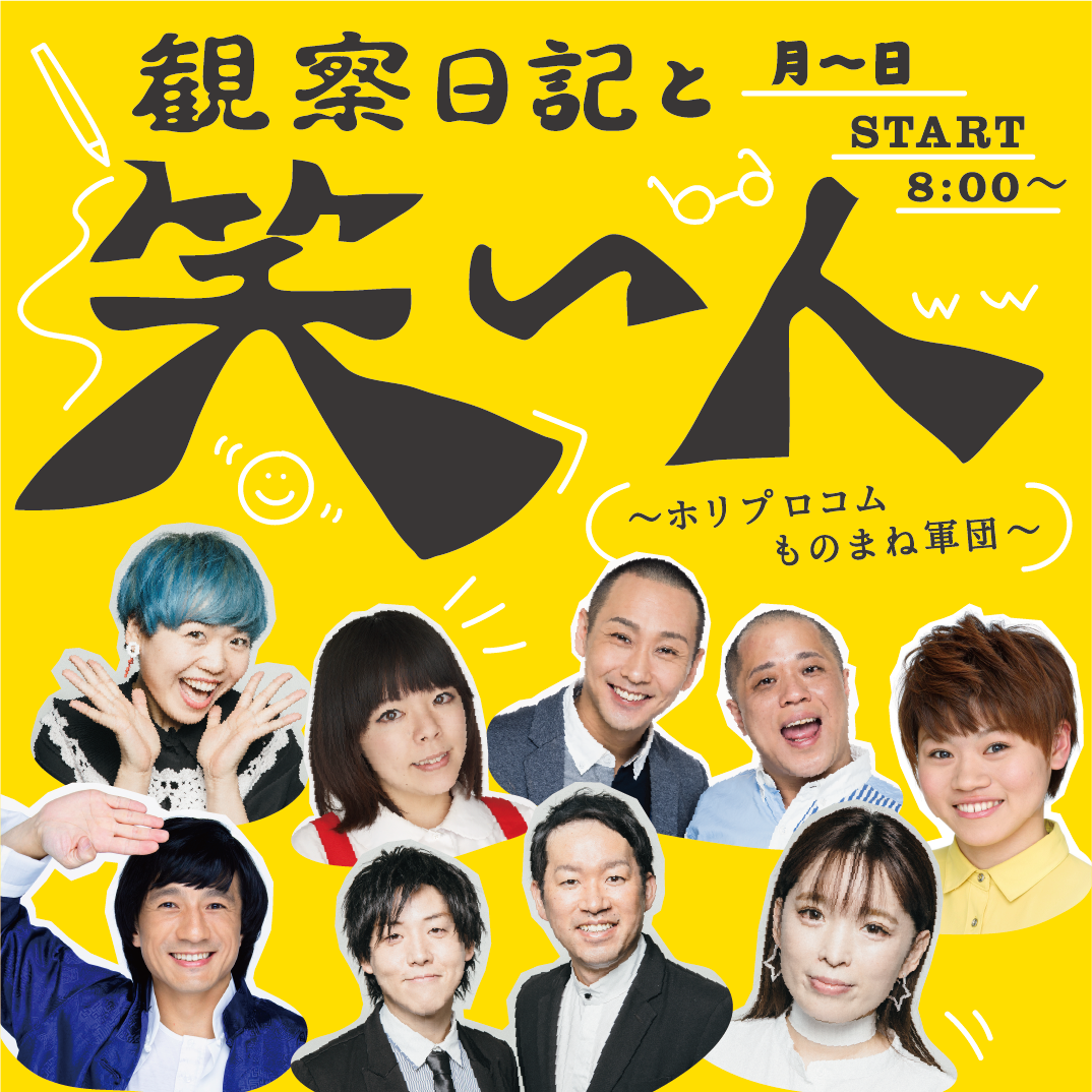 毎日朝8時から配信される「観察日記と笑い人~ホリプロコムものまね軍団~」は、ホリプロコム所属ものまね軍団との提携番組。“まねる”ことに長けたものまね軍団メンバーがもつ”観察眼”に注目。数々のものまねグランプリで頂点に輝く「モリタク!&河口こうへい 」をMCに迎え、「ものまね芸人を志した源泉」から普段テレビや他では聴けない「本音トーク」や「初公開となるネタ」、ノリなしの「マジトーク」も。。。突然始まる”ものまね劇”にも注目です。