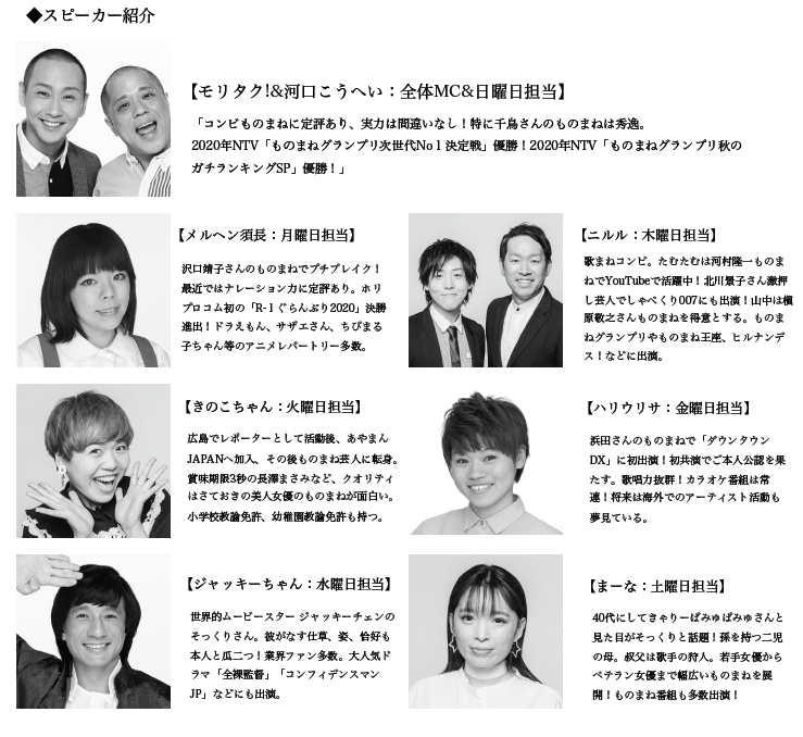 本番組は「観察日記と笑い人〜ホリプロコムものまね軍団〜」では、数々のものまねグランプリで頂点に輝く「モリタク!&河口こうへい」の2人がMCを担当。スピーカーは、沢口靖子さんのものまねでプチブレイクした「メルヘン須長」、美人女優のものまねが面白い「きのこちゃん」、世界的ムービースター ジャッキーチェンのそっくりさん「ジャッキーちゃん」、歌まねコンビ「ニルル」、ダウンタウン浜田さんのものまねで「ダウンタウンDX」に初出演、初共演でご本人公認を果たし歌唱力抜群の「ハリウリサ」、きゃりーぱみゅぱみゅさんと見た目がそっくりと話題の「まーな」が登場。トーク中に突然始まる”ものまね劇”も注目です。
