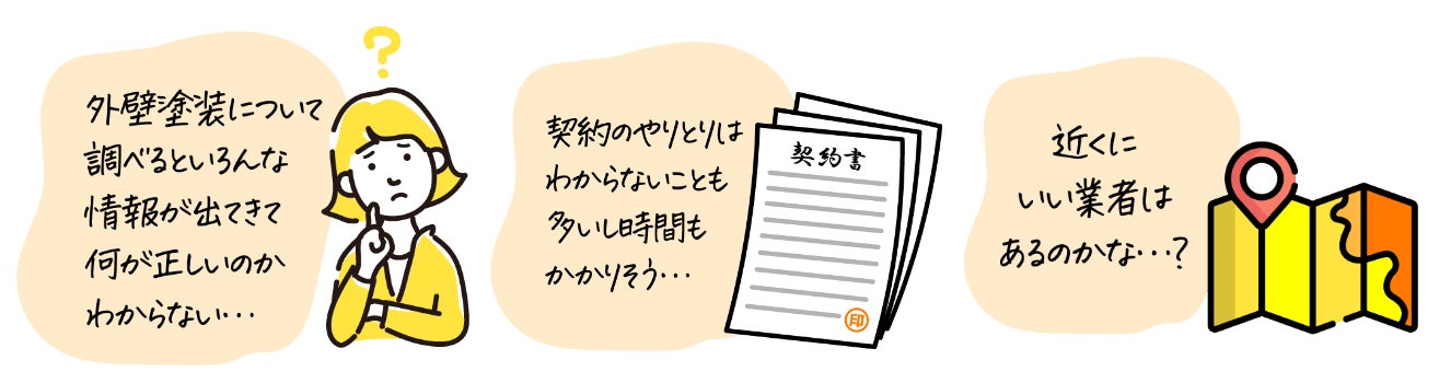 外壁塗装工事について「相場観がわからない」「何を基準に選べばいいのかわからない」など、お客様の疑問や不安を解消し、ご希望に沿った外壁塗装業者をご紹介するサービスです。見積もり比較、さらに外壁塗装業者との契約まで全て「無料」でご利用いただけます。