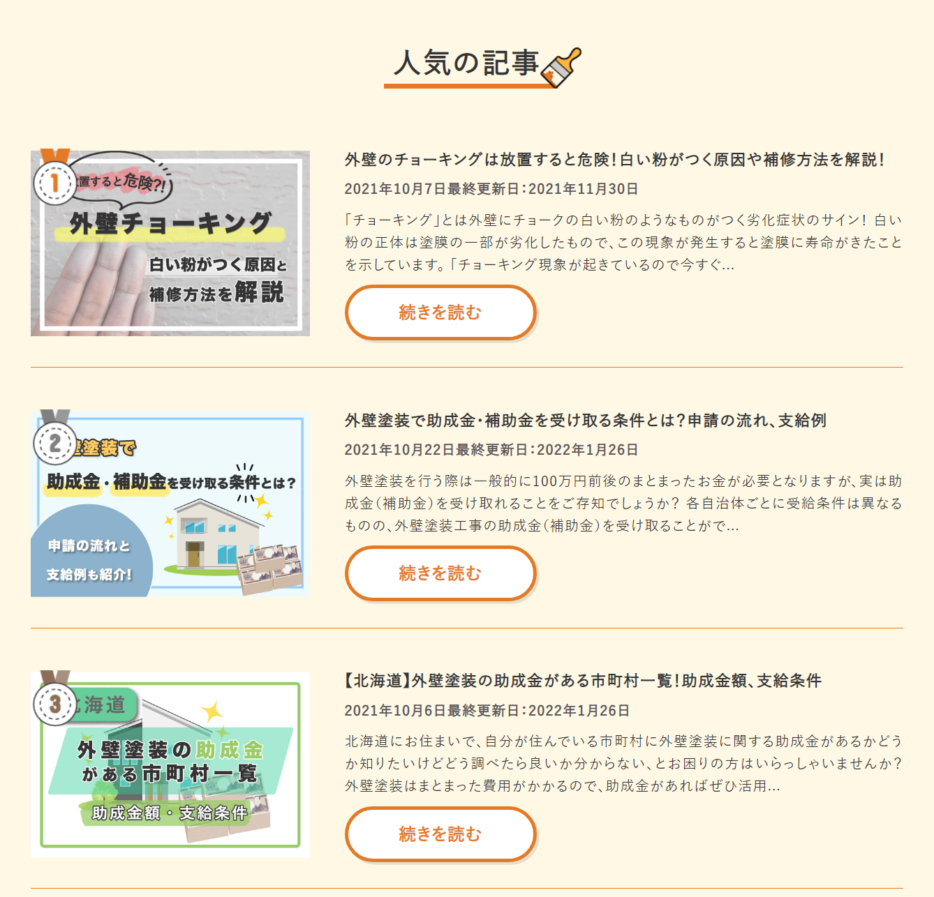 外壁塗装エージェントのWEBサイトでは、外壁塗装の基礎知識から都道府県ごとの助成金の紹介、よくあるトラブルなどについて、わかりやすく解説した記事を掲載しております。