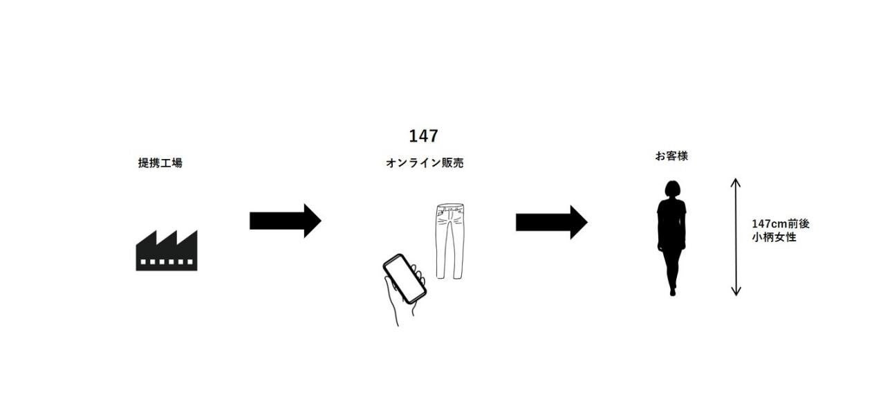 「147」の生産から販売までのプロセス。特定サイズの洋服は生産数が限られるためどうしても価格が高くなってしまうが、147は提携工場から直でオリジナル企画の洋服を生産、実店舗を持たずオンラインで直接販売することで、小柄女性に特化したサイズで、且つ品質にもこだわった洋服をお求めやすい価格で提案しています。