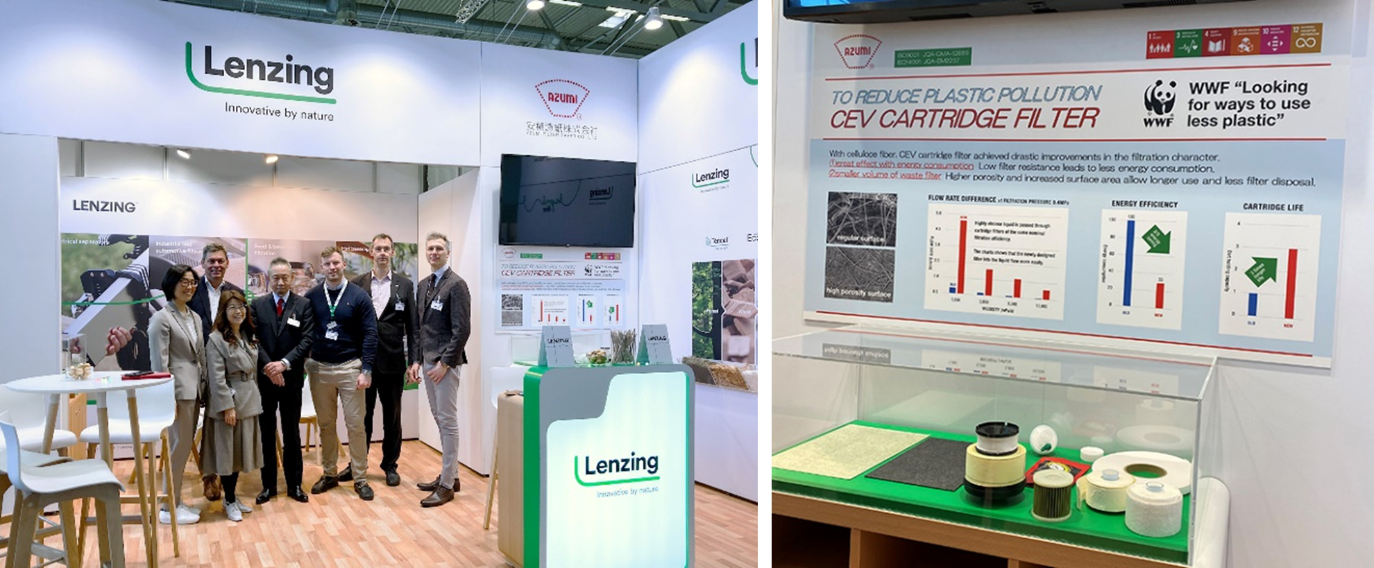 レンチング・グループ(本社:オーストリア、以下レンチング社)は、2023年2月14日から3日間、ドイツ ケルンのケルンメッセで開催された「FILTECH2023」に出展しました。今回は日本より、創業100年を超える歴史をもつ安積濾紙(あづみろし)株式会社(本社:大阪府大阪市 代表取締役社長 安積 覚、以下安積濾紙社)と共同で出展し、植物由来のセルロース繊維「レンチング™ リヨセル繊維」を原料とするフィルター製品を展示、具体的な用途例を紹介しました。今回、安積濾紙社とのパートナーシップ強化のため、技術者や営業スタッフを現地に派遣し、ともに海外市場の開拓に臨みました。