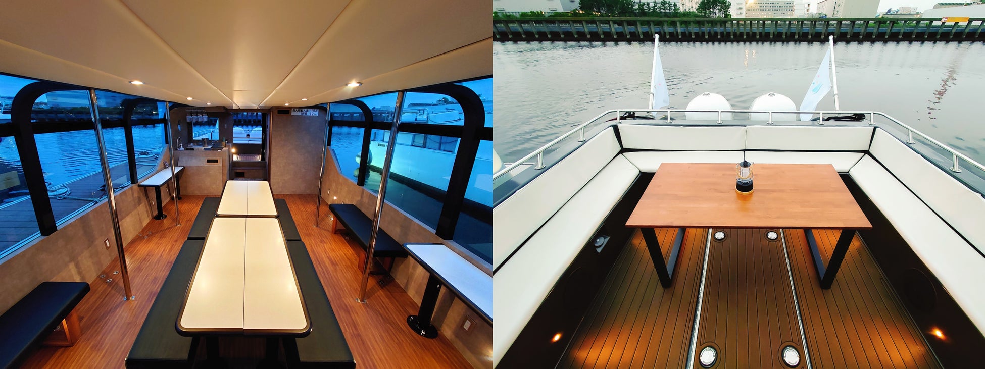 ヴェネツィアのウォータータクシーとリムジン(操縦席と客室が隔離されプライベート空間を確保)を掛け合わせたような唯⼀無⼆の完全オリジナルリバークルーズ船は、室内はまるでホテルのラウンジのようなインテリアデザイン、そして、後部のオープンデッキでは、東京を川から眺められ、いつもと違う景色を風を感じながら楽しむ、その解放感は最⾼です。通気性も良く、広々とした船内に、限られた特別なお客様をワンランク上のリバークルーズへご案内します。