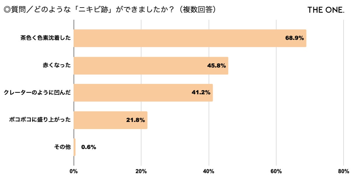 ◎【ランキング】①色素沈着(68.9%)②赤くなった(45.8%)③クレーターのように凹んだ(41.2%)④ボコボコに盛り上がった(21.8%)