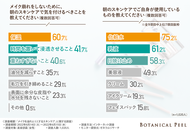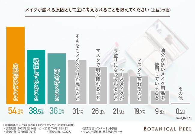 そこで今回、『BOTANICAL PEEL』(https://www.botanical-peel.com/)を販売する株式会社CREDEAは、美容部員(女性)を対象に、「メイクを崩れにくくするスキンケア」に関する調査を実施しました。