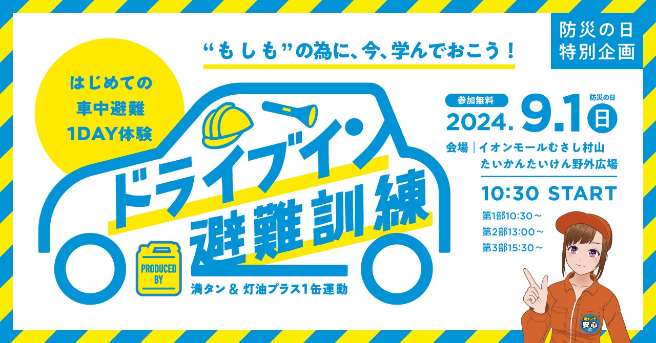 なお、9月1日(日)には、政府が避難スペースの事前指定を自治体に促す指針の策定に向け動く、車中避難に関する正しい知識を家族みんなで学ぶ、体感型『ドライブイン避難訓練』をイオンモールむさし村山にて実施。車中避難の過ごし方、安全に過ごすための実践型ワークショップなどを行います。なお、イベント当日の第1部には3人のお子さんを育てる、タレントの藤本美貴さんをお招きしたトークショーも予定しております。
