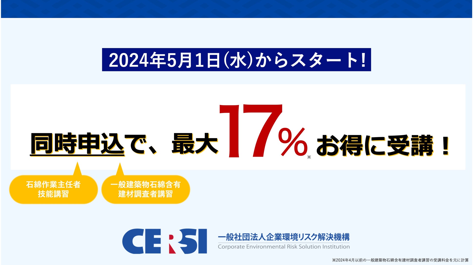 一般社団法人企業環境リスク解決機構(東京都港区 代表理事上川路 宏、以下 CERSI)は、ほぼ全ての工事従事者にとって取得必須の「一般建築物石綿含有建材調査者講習(以下、石綿調査者講習)」および「石綿作業主任者技能講習(以下、石綿主任者講習)」の同時申込の受付を、2024年5月1日(水)よりスタートいたします。また、同時申込限定のセット割引も同日より適用となります。