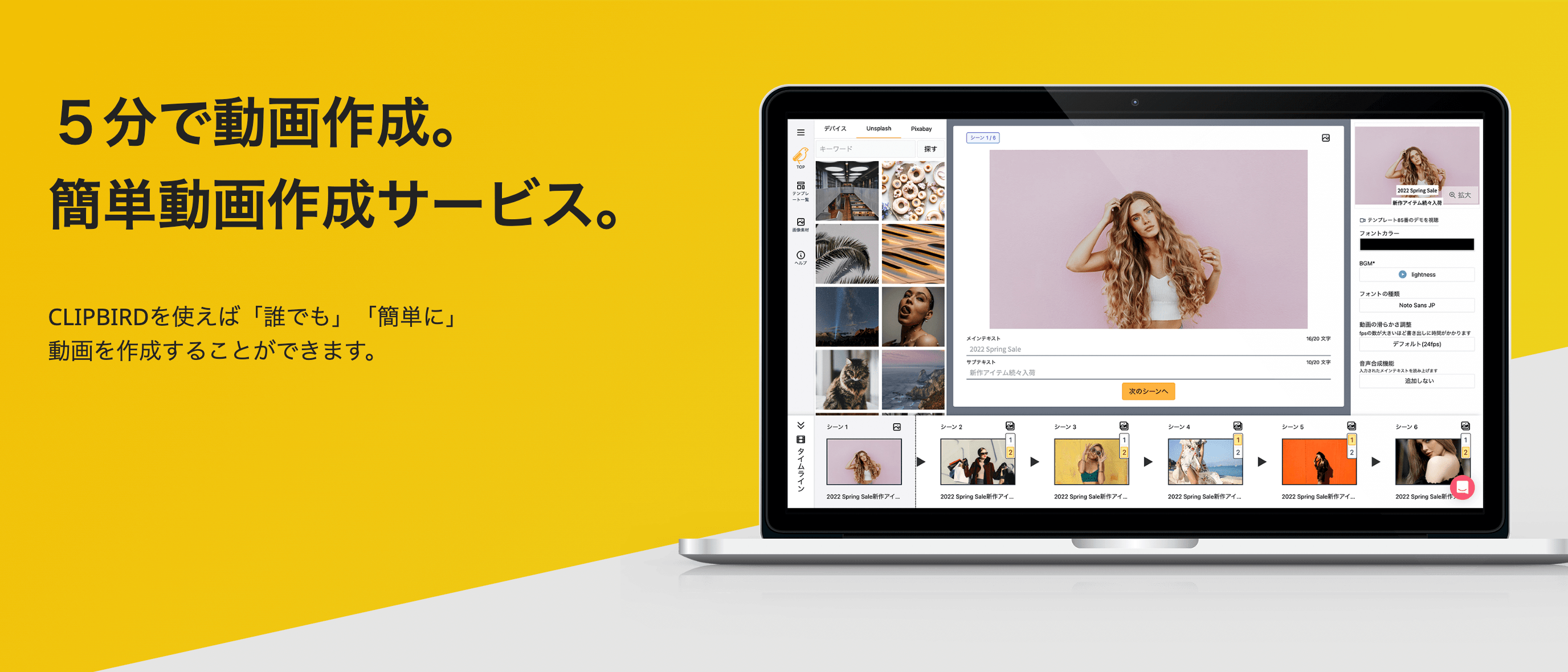 CLIPBIRDとは、「画像とテキストを入れるだけで」「5分で」クオリティの高い動画をすぐに作成できるサービスです。