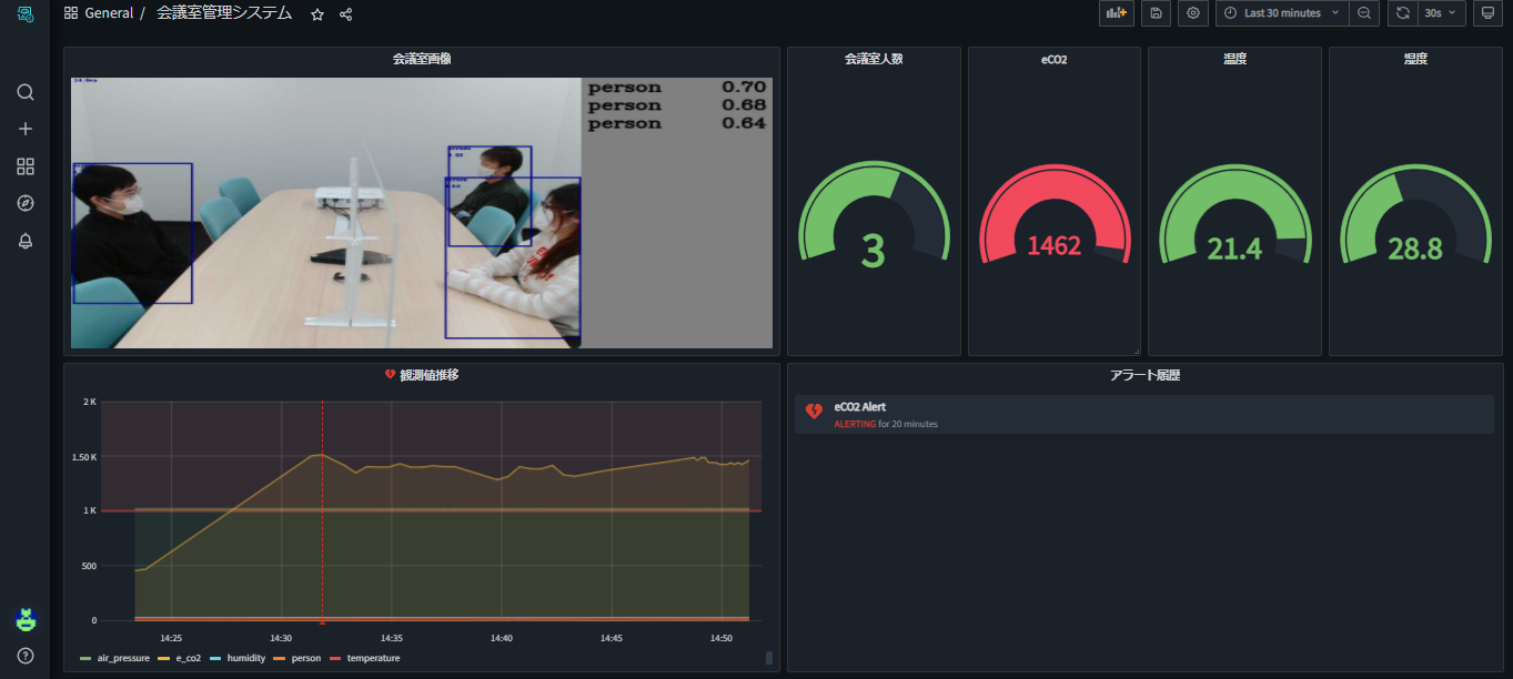 ■SORACOM Lagoonによって可視化されたダッシュボード(画像/人数/CO2/温度/湿度/推移/アラート履歴)