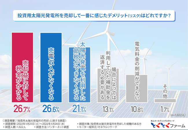 そこで、「投資用太陽光発電所を売却して一番に感じたデメリット(リスク)はどれですか?」と質問したところ、『売却益に対して税金がかかる(26.7%)』と回答した方が最も多く、次いで『売電収入がなくなる(26.6%)』『太陽光発電を利用した節税ができなくなる(21.1%)』と続きました。