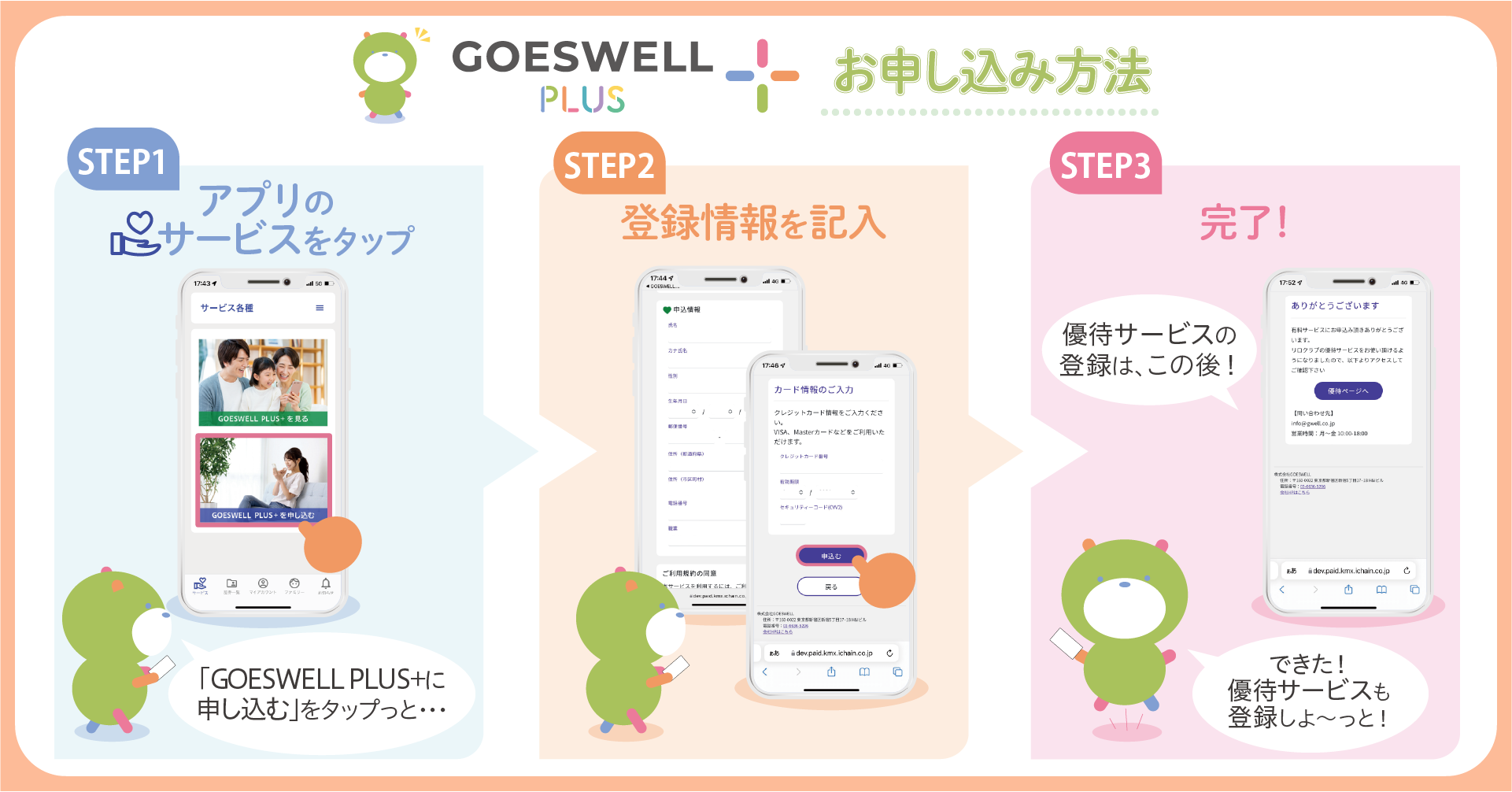 GOESWELL PLUS+は保険管理アプリ「GOESWELL」(以下:GOESWELLアプリ)から申し込みができる、サブスクリプション型の会員サービスです。