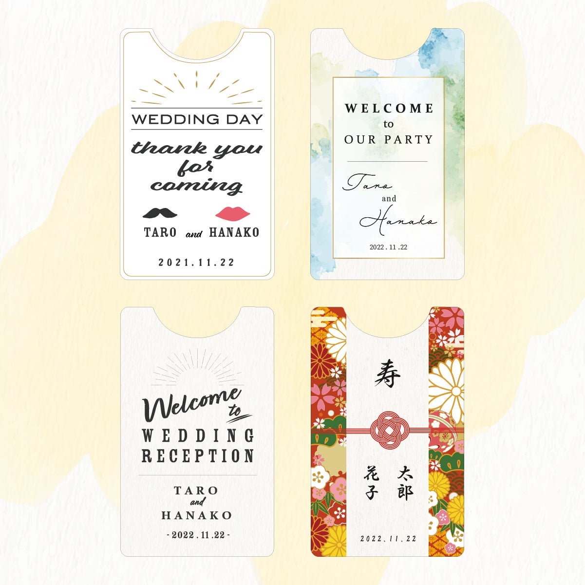 ウェディングシーンのプチギフトやお祝い事のプレゼントとして使っていただけるように、ウェディングカード風デザイン4種類、熨斗(のし)柄デザイン4種類をご用意しました。
