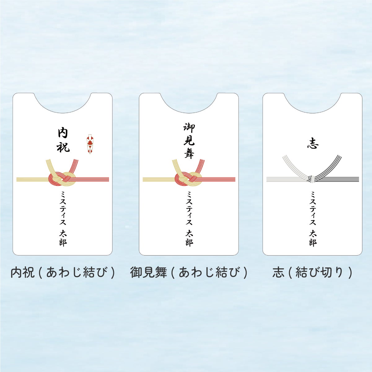 シンプルで贈るシーンを選ばず使える通常の熨斗柄の他、カジュアルなデザインの熨斗柄や、お名前入れなしのパターンもご用意しているので、好みに合わせたデザインをお選びください。