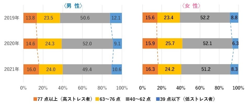 2017年から行っている「ココロの体力測定」では、ストレス状況に男女で違いがあることがわかっています。高ストレス男性の割合は、2019年度13.8%から2021年度16.0%と2.2ポイント増、女性は2019年度15.6%から2021年度16.3%と0.7ポイント増。低ストレス者は、男性は2019年度12.1%から2021年度10.6%と1.5ポイント減、女性は2019年度8.8%から2021年度8.3%と0.5ポイント減と、男女比較では男性の方がより、高ストレス者増・低ストレス者減傾向となりました。