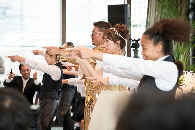 LIVEの始まりを感じさせる迫力のオープニングムービー、ゲストと一緒に楽しめるダンス演出、未来のアーティストをめざすEXPGダンサーによるパフォーマンスショーなどカップルの希望に寄り添いプロデュース。その他アーティストたちのサイン入りタペストリーやカップルの名前入りフラッグなど、数々のエンタテインメントをプロデュースしてきた LDH JAPANならではのパッケージプランです。