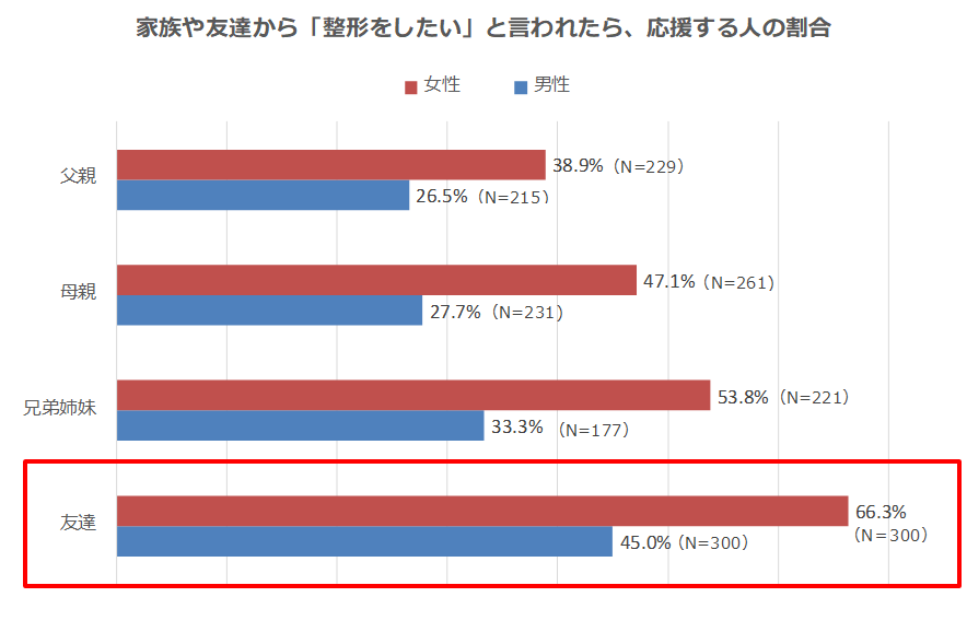 身近な人(父親・母親・兄弟姉妹・友達)が整形をすることに対して応援する割合は、女性が父親38.9%、母親47.1%、兄弟姉妹53.8%、友達66.3%、男性が父親26.5%、母親27.7%、兄弟姉妹33.3%、友達45.0%という結果になりました。男女で比較すると大きな差があり、男性の方がまだ、美容整形への抵抗があることが明らかになりましたが、男女ともに友達の整形を応援するという割合は4割を超えています。