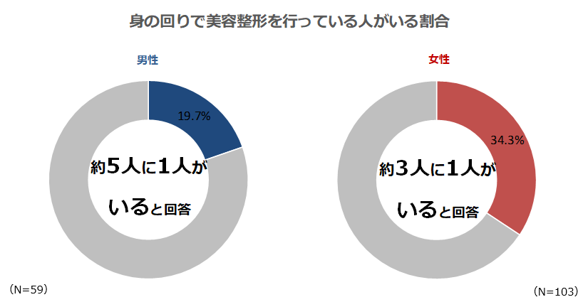 身の回りで整形をしている人がいると回答した人は、男性が約5人に1人の19.7%で、女性が約3人に1人の34.3%という結果となり、自分自身は施術を受けていないものの、身近な人で整形をしている人が多くいることが明らかになりました。
