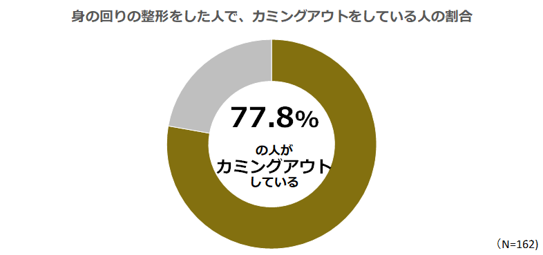 更に、身の回りの整形をしている人がカミングアウトしているという人は77.8%となり、整形は隠すものではなく、オープンにしている人が非常に多いことがわかりました。