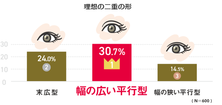 理想の二重の形は、男女ともに1位が幅の広い平行型、2位が末広型、3位が幅の狭い平行型となり、
