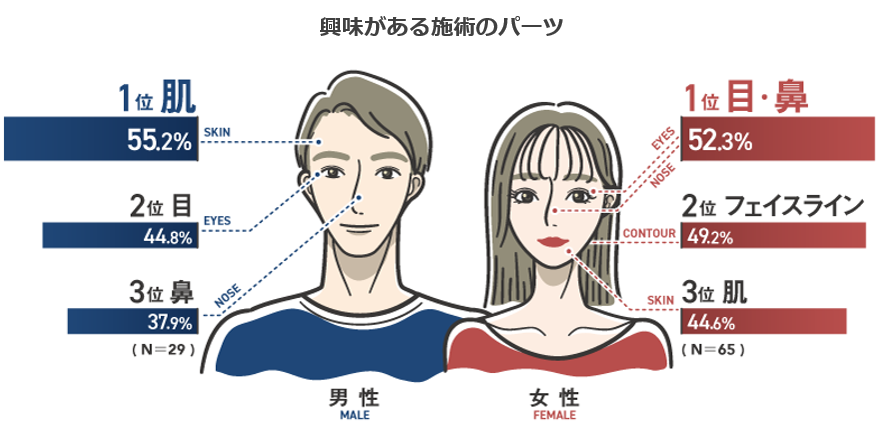 また、美容整形に興味がある人が施術を受けてみたい部位は男女で差があり、女性の1位は「目」と「鼻」(52.3%)、2位がフェイスライン(49.2%)、3位が「肌」(44.6%)に。男性の1位は「肌」(55.2%)、2位は「目」(44.8%)、3位が「鼻」(37.9%)という結果になりました。男女ともに顔のパーツを整形したいという回答が多くなりましたが、希望するパーツには変化が出たことから、男女で美容整形に求めるものが違うということがわかりました。