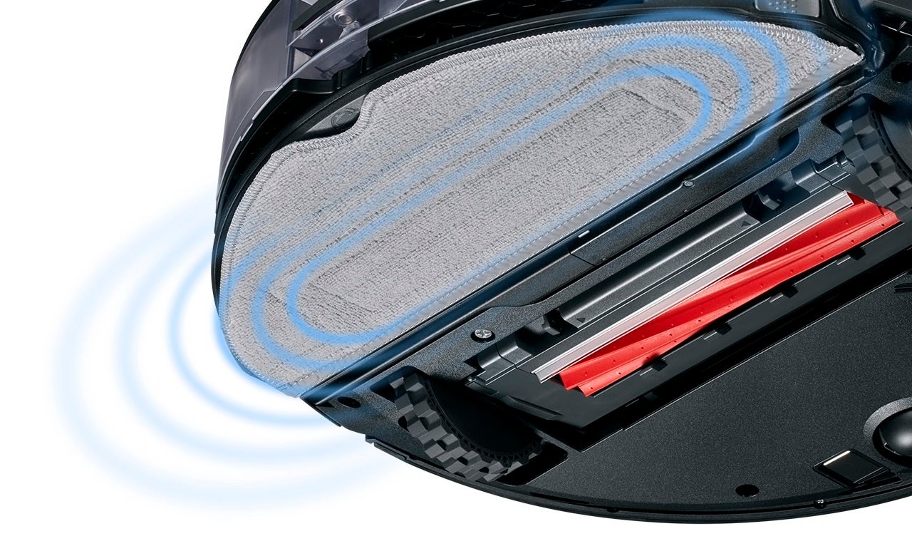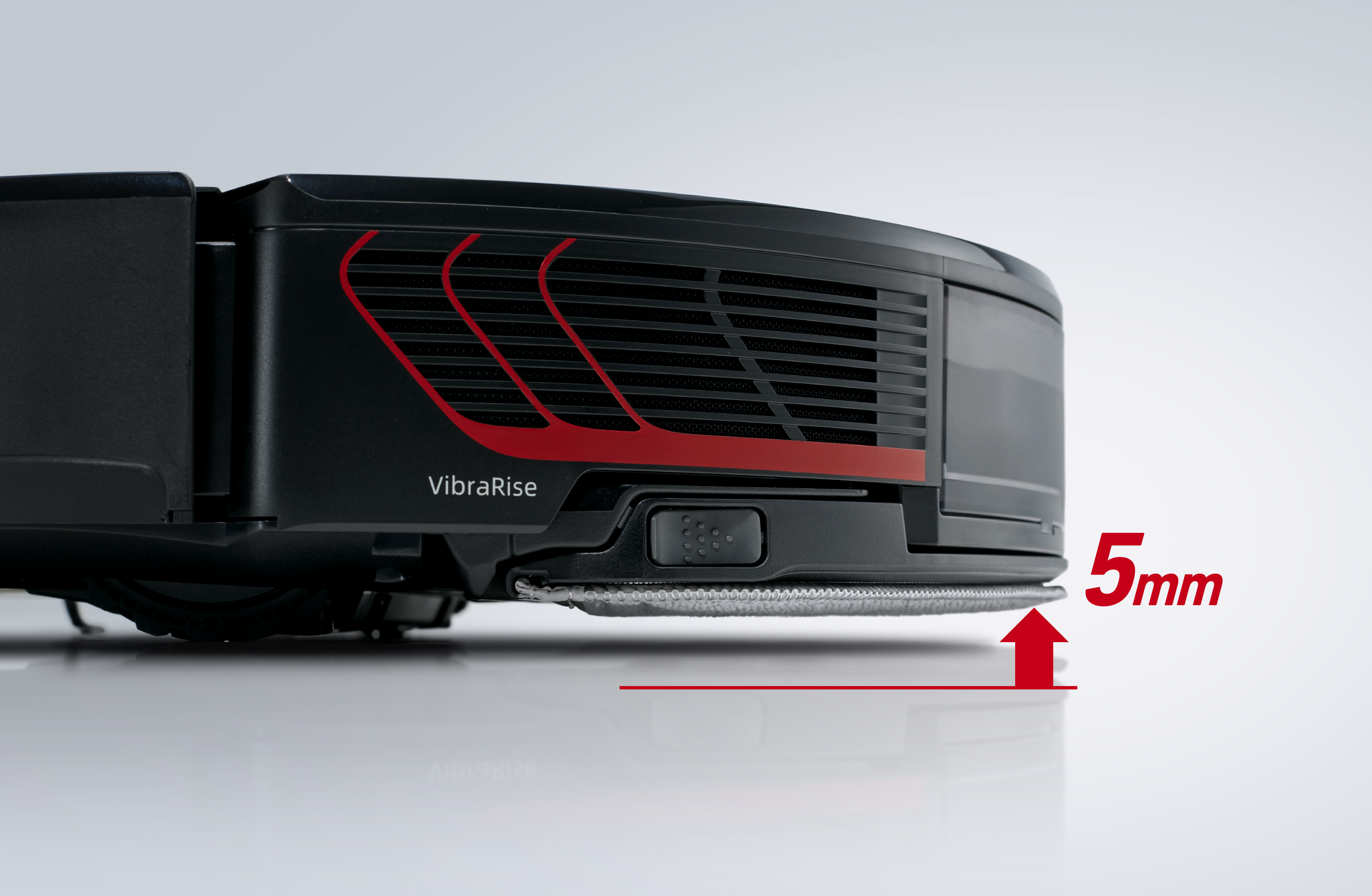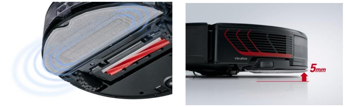 また、水拭きではこれまでの最上位機種であったS7シリーズの水拭き性能を全て搭載しました。最大毎分3000回動く高速振動モップと600gの高加重モップにより、皮脂、コーヒー、花粉など、こびり付いた汚れも綺麗に拭き上げます。さらに、水拭き掃除中に超音波センサーがカーペット※8 を検知すると、 水拭きモップが自動で 5 ㎜持ち上がり、吸引掃除のみを行えるなど、利便性も高い掃除を行います。
