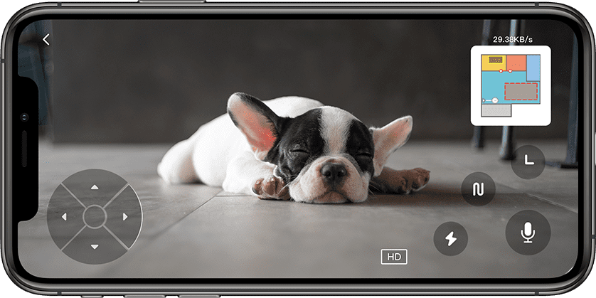 本体搭載のカメラで撮影している映像は、スマートフォンのアプリで見ることができ、留守中の自宅の見守りとして、部屋の様子をリアルタイムで確認することが可能です。また、アプリを使い、遠隔から本体を操作できるので、外出先からペットなどの様子を確認できます。さらに、本体にマイクを搭載しており、新たに双方向の通話が可能になりました。
